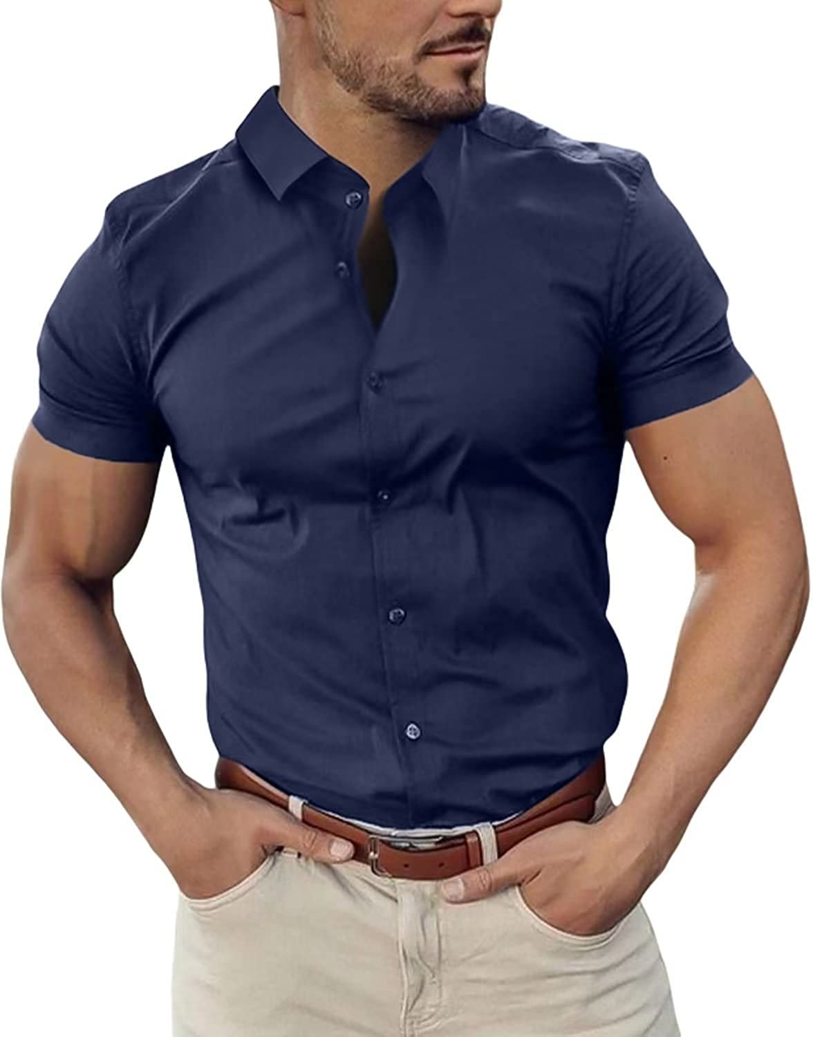 Mens Muscle Fit Dress Shirts Short Sleeve Slim Fit Casual Button Down Shirts