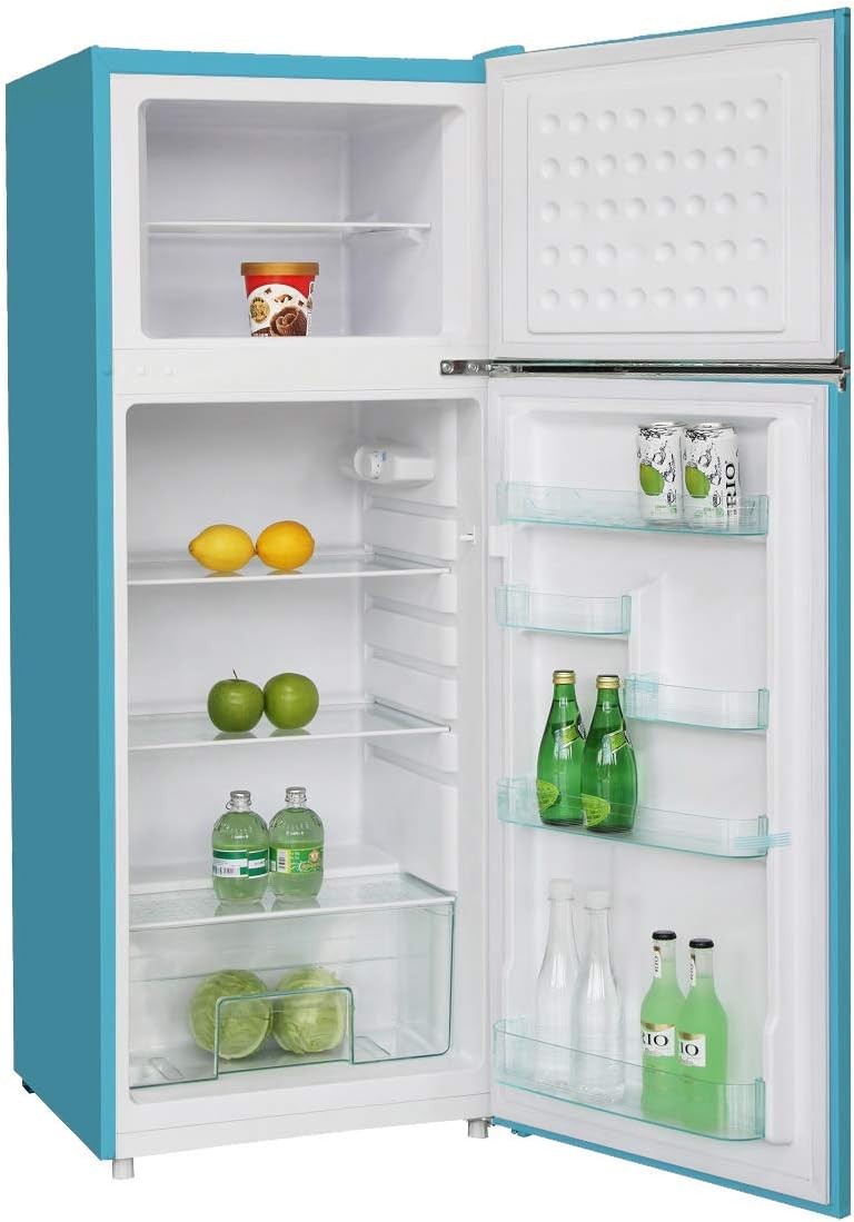 LARGE CAPACITY: This mini fridge has 7.5 Cu Ft of storage capacity to let you keep all of your favourite food and beverages cool. Combines easy-to-use features with a retro and practical design to complement any kitchen.Lock Type:Electronic FREEZER COMPARTMENT: Full-width, fixed wire freezer shelf and door bin provide organized storage for frozen foods. Bright incandescent lighting illuminates your food and freezer compartments so you can easily find the right food item. SHELVES & STORAGE: Storage bins in the door help to keep smaller items handy and organized. Vegetable and fruit crisper bins help preserve the freshness of fruits and vegetables. EASY TO CLEAN: Spill-proof glass shelves contain spills and simplify cleanup, preventing liquids from leaking onto shelves below. Manual defrost mode to remove ice easily ADAPTABLE: Reversible door allows for convenient and attractive placement anywhere in your home or garage. Adjustable legs ensure your refrigerator is always level even when your floor is not