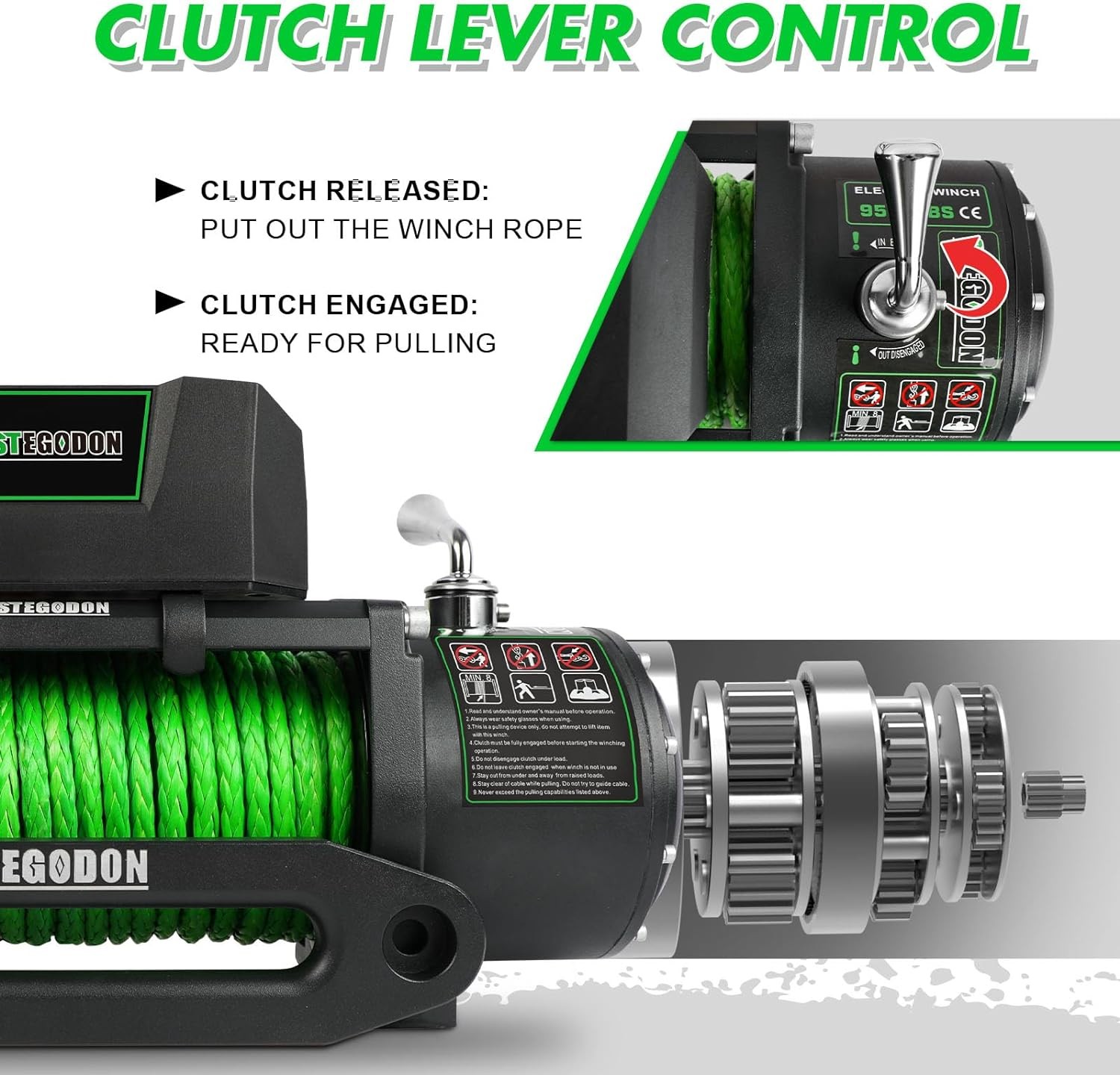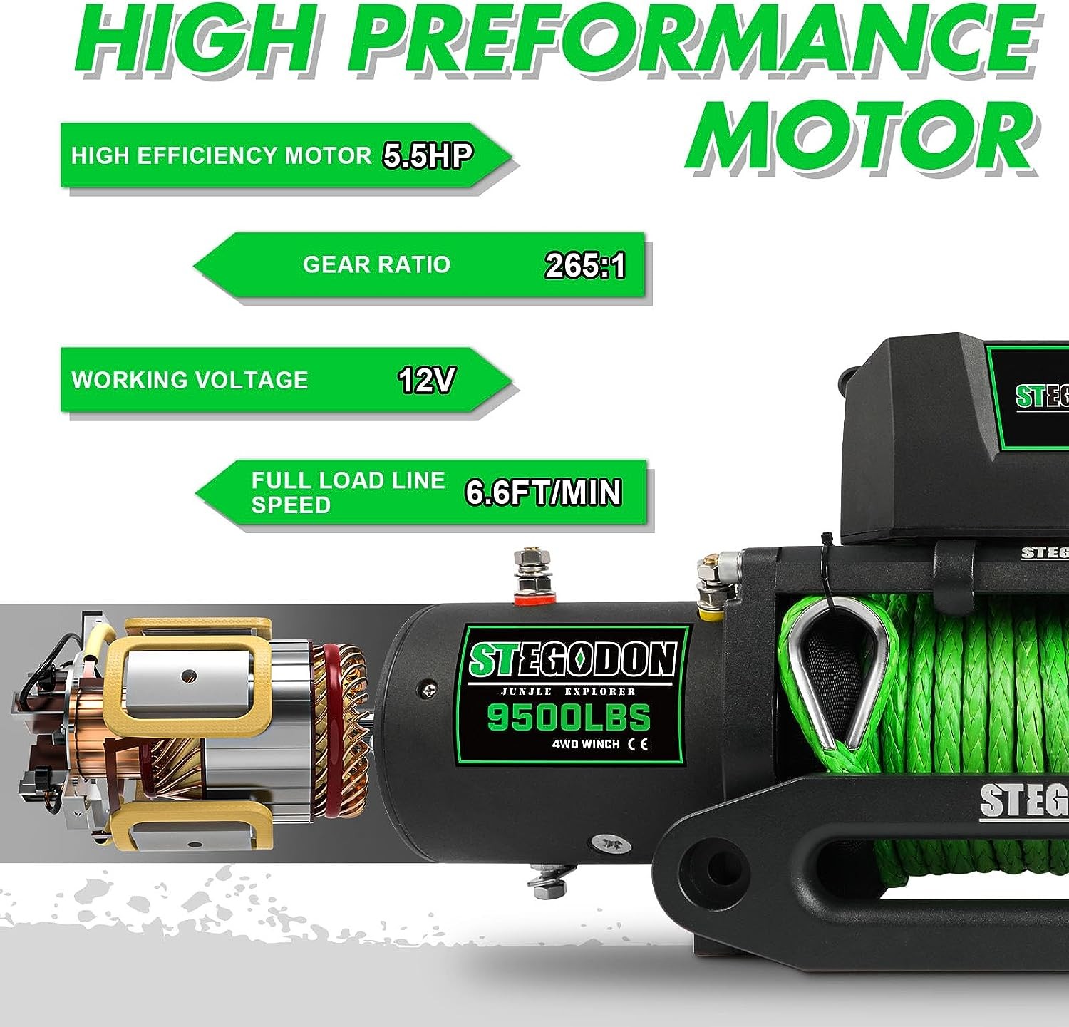 STEGODON New 9500 lb. Load Capacity Electric Winch S3,12V Waterproof IP67 Electric Winch with Hawse Fairlead, Synthetic Rope Winch with Wireless Handheld Remote and Wired Handle(Green-Rope)