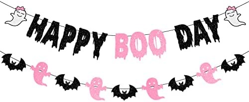 WHAT YOU WILL GET - 1 pieces pink black glittery happy boo day Banner, one says glitter "HAPPY BOO DAY" with white ghost signs, the other is bat and ghost pattern banner, perfect to add funny atmosphere for your Halloween birthday party. PINK BLACK GLITTER BANNER - Each letter height approx is 6.7 inch / 17 cm. The Bat sign height is 3.9 inch /10 cm and the ghost height is 5.5 inch / 14 cm. Each banner string is 3 meters / 9.8 feet. High quality pink black glittery paper card and black satin ribbons, make your Halloween birthday party more unique! NO DIY REQUIRED - You can decorate with ease as it comes pre-assembled which means you just only need to hang it on the mantle, wall, ceiling, over your cake table, on tree or on the entrance door to trigger the excitement. Each cards are cautiously made and can be moved to your ideal distance! HALLOWEEN BIRTHDAY PARTY DECORATIONS - Suitable for Halloween birthday or baby shower party decorations, Halloween ghost themed fireplace, mantle, wall decorations. Brilliant decoration prop for Halloween to create pleasant and warm atmosphere. UNIQUE HALLOWEEN BACKDROP - Perfect for hunging from branches and ceilings, or open against a wall, hanging up dessert tables, the adornment of the integral collocation of color is also very perfect place. Perfect for girl Halloween boo day party decorations.