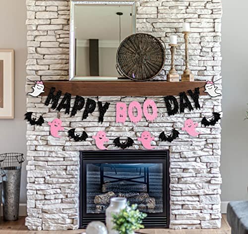 JOZON Pink Black Glittery Happy Boo Day Banner with Bat and Ghost Signs Halloween Birthday Banner Garland Halloween Party Decorations for Girl Birthday Mantle Fireplace Wall Party Supplies