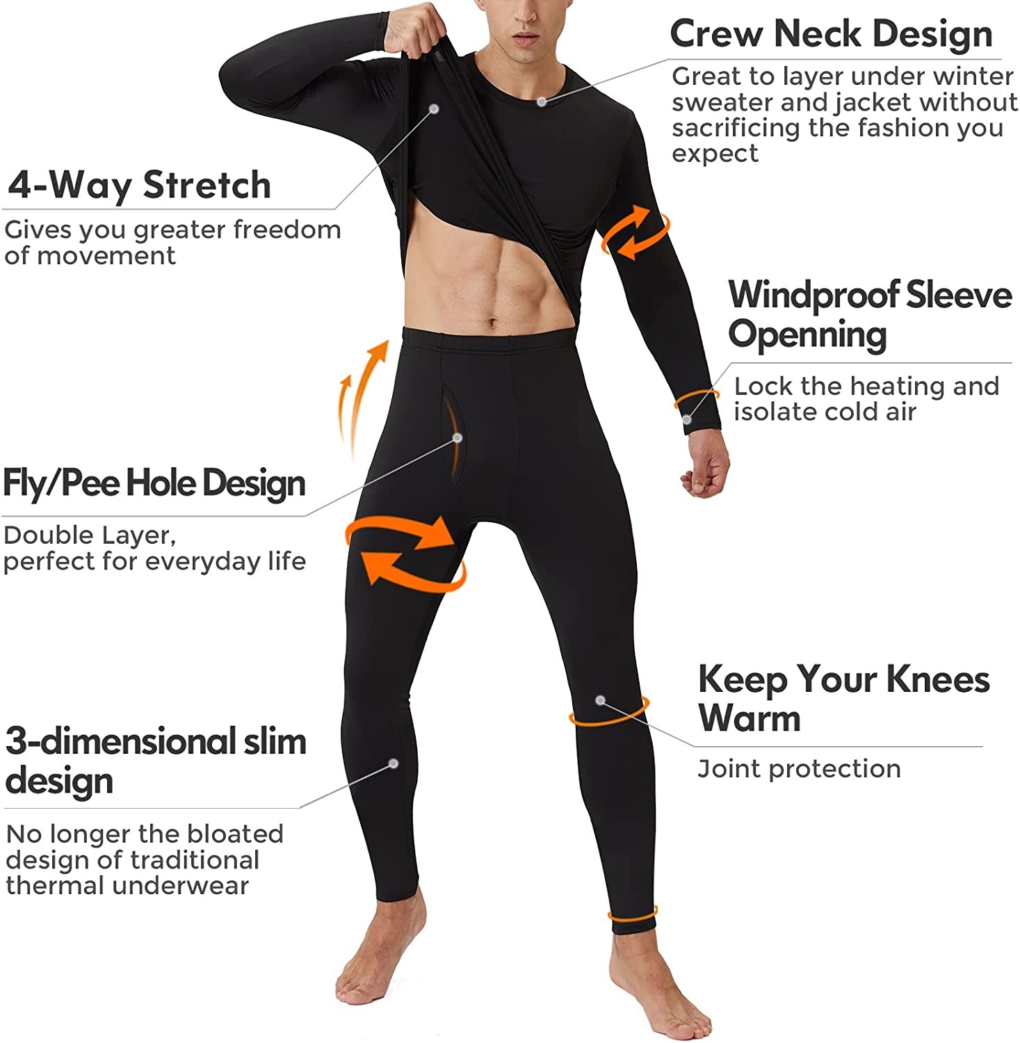 ?[Tagless & Pee Hole Design]: For even more added comfort, long johns for men thermal have no tags, which reduces any skin irritation; The thermal pants has a elastic waistband that helps to fit most men's figures and are easily put on and taken off. And the humanized Fly Hole design is perfect for daily life. What's more, the long underwear are reinforced with design details on the elastic collar at the neckline, cuffs and other joints to help you withstand the cold.