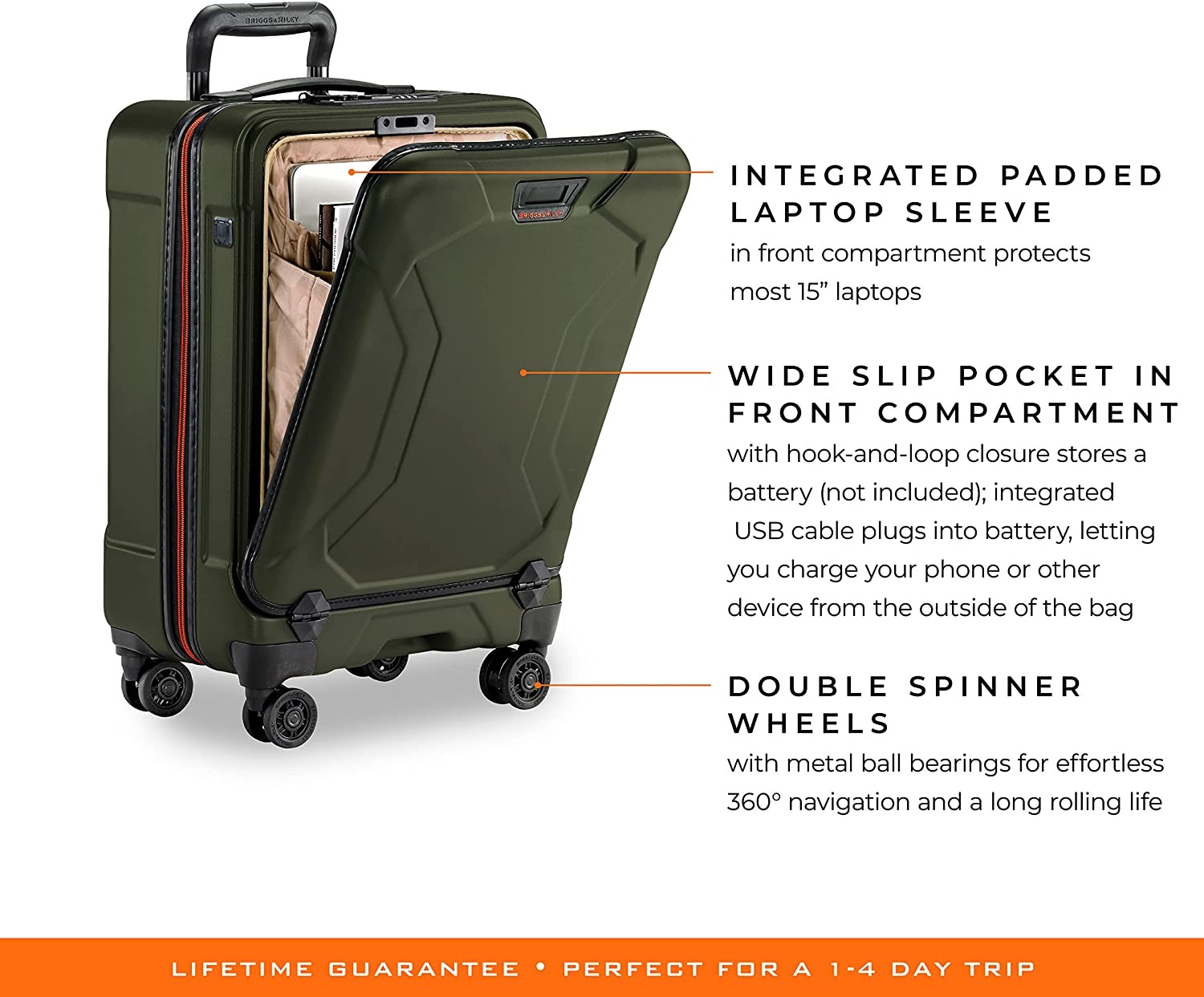 INNOVATION FIRST: The ONLY hardside spinner with a hardside front pocket, hinged door allows access to pocket during travel without opening entire suitcase; Store a laptop, travel items and power bank in front pocket; External USB port for mobile charging HIGHEST RATED LUGGAGE W/ LIFETIME WARRANTY: Two-time Top rated luggage brand by Consumer Reports reader survey, extensive quality and durability tested; If your bag is ever broken or damaged, even by an airline, Briggs & Riley will repair it for free HIGH PERFORMANCE LUGGAGE: 3-layer 100% virgin Makrolon polycarbonate material is high-strength, lightweight & resilient to minimize cracks; Aircraft-grade aluminum telescoping Outsider handle with 4 stop heights; Metal ball-bearing double spinner wheels ORGANIZATION FOR TRAVEL: Front compartment has padded laptop & tablet slips protecting most 15 Inch laptops & 10.5 Inch tablets; Main compartment has wide garment securing compression panels and mesh pocket in lid features built-in garment suiter DIMENSIONS AND CAPACITY: 22 Inch H x 14 Inch W x 9 Inch D. 2741.1 cubic inches capacity. Weighs 6.9 lbs. Dimensions include wheels and handle.