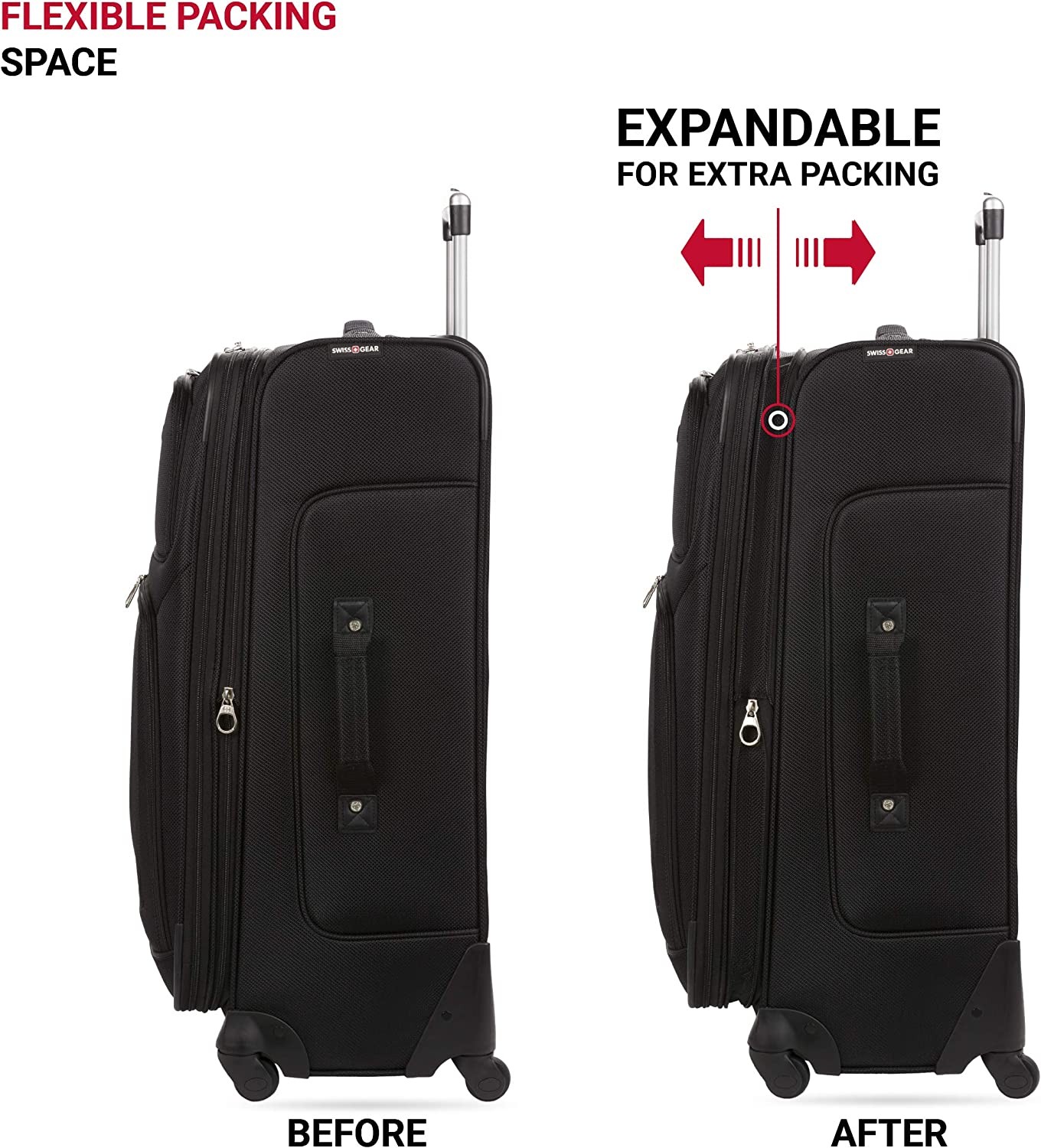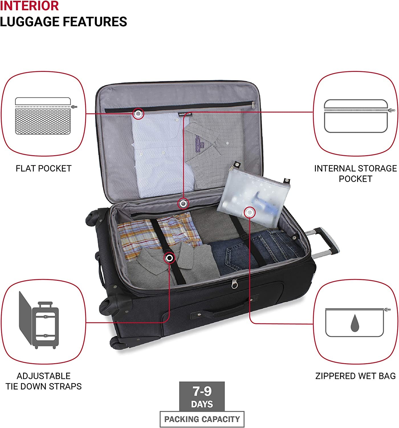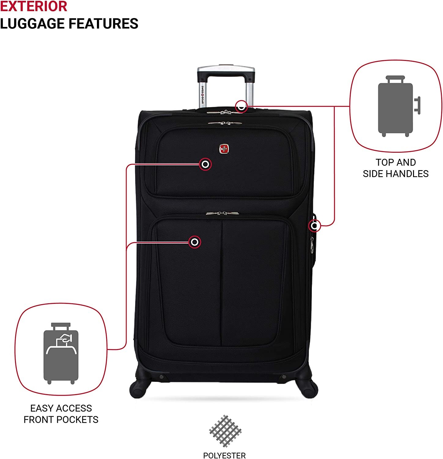 Rolling Suitcase: Get through a crowded airport easily with this stylish check-in luggage with 360-degree multi-directional spinner wheels and a locking retractable push/pull handle Multiple Front Panel Pockets: Featuring front pockets with a built-in ID tag, this ergonomically expandable luggage measures 30 x 18.5 x 12.5 inches including wheels and handles; packing dimensions are 28.5 x 17.25 x 12.5 inches Secure and Durable: Expandable travel case gives you ample parking space and made from a durable, scuff-resistant polyester fabric with fully lined interior; also features adjustable tie-down straps for securing garments in place Effortless Organization: This luggage bag maximizes packing efficiency with a removable zippered wet bag, large mesh lid pocket, and packing pocket for holding small items and accessories Convenient Side Handles: With reinforced padded top handle with an integrated side and bottom handle, this roller suitcase makes lifting and carrying your luggage easy
