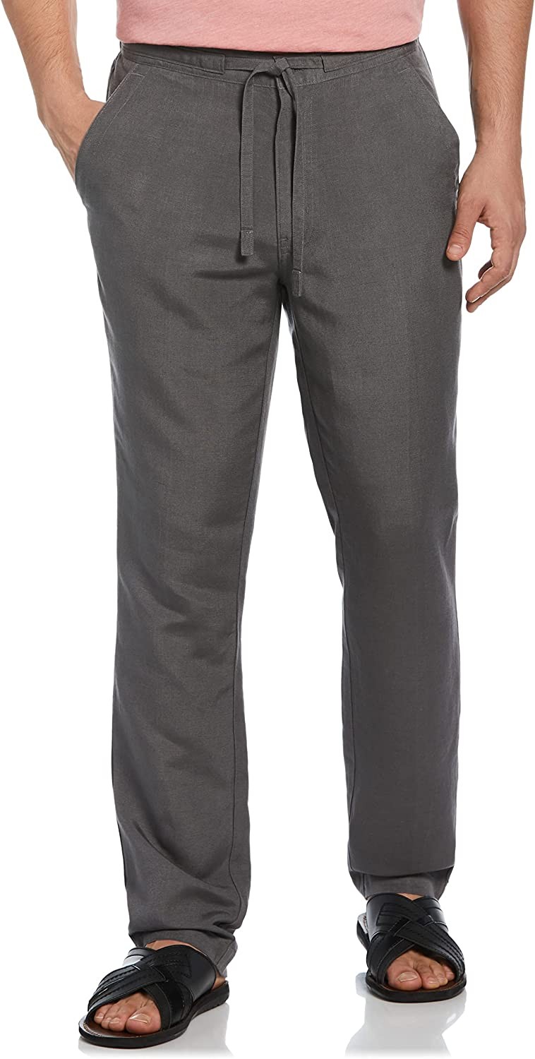 TOTAL COMFORT AND STYLE: Look and feel your best in these trousers for men. The pants feature our classic relaxed fit with a roomier leg. Two quarter slant front pockets and two button-through back pockets let you keep essentials closeby. BREATHABLE: These casual men's pants consists of a blend of 55% linen and 45% viscose, creating a lightweight, breathable fabric that will keep you cool on warm weather days. ELASTIC WAISTBAND: These slacks for men feature an elastic waistband with a drawstring. This allows you to adjust the waist tightness to your liking, helping to keep you feeling comfortable all day long. DURABLE: Plain weave fabrication creates a tightly woven pattern for extra durability, so you can get the most out of these casual men's pants that are sure to become a favorite. EXTENDED SIZES: These men's pants are made for style and comfort with a range of available sizes from regular to big and tall.