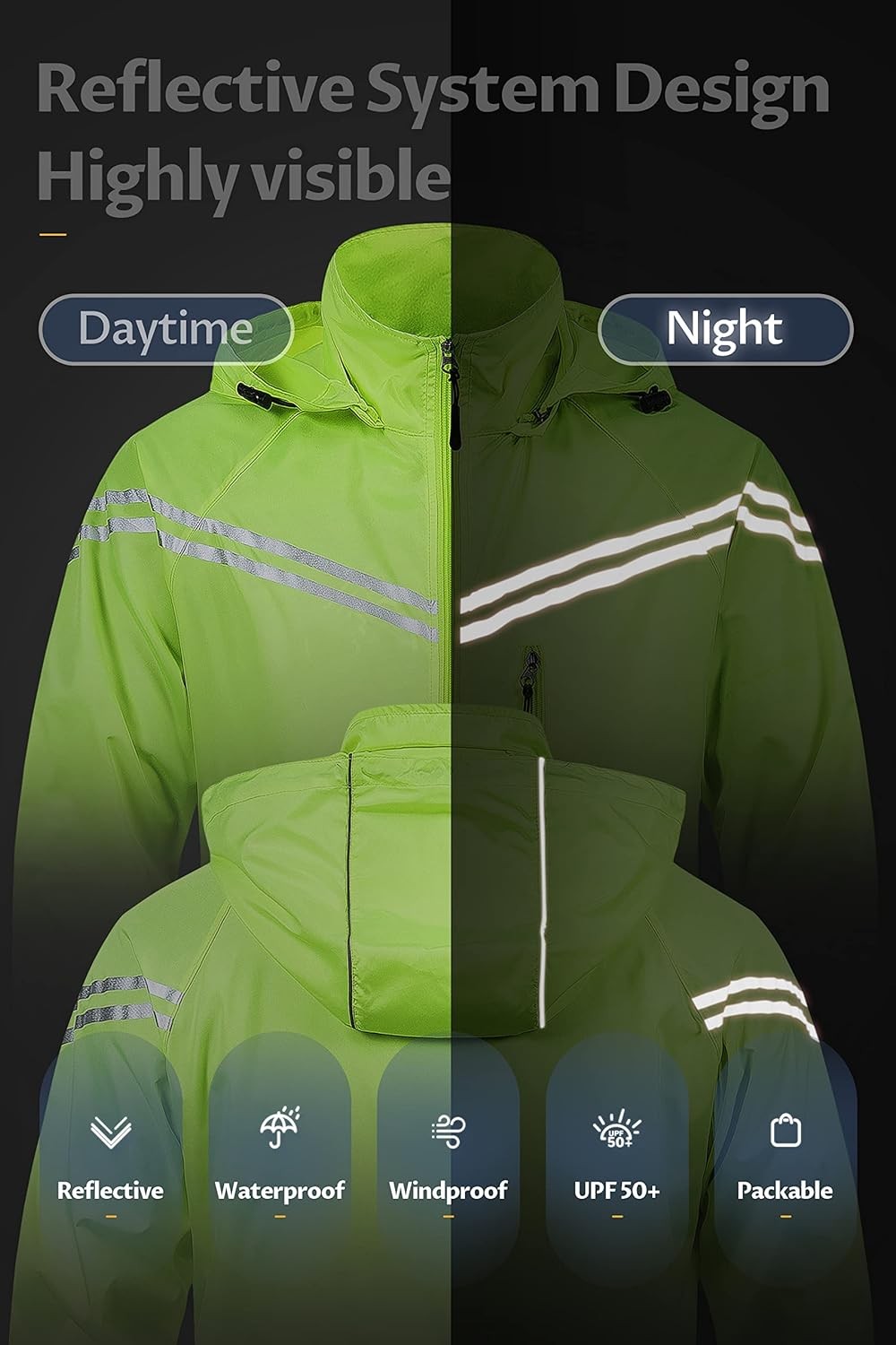 CREATMO US Men's Packable Waterproof Running Rain Coats Reflective Cycling Jacket Windbreaker With Removable Hood