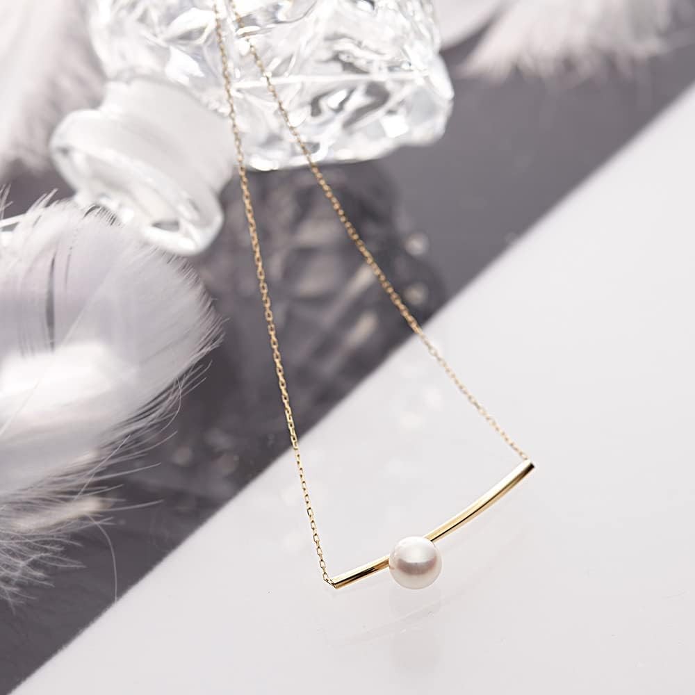 The "Svelte Line" pendant has a smooth gold line and pearls that add a presence to your chest.