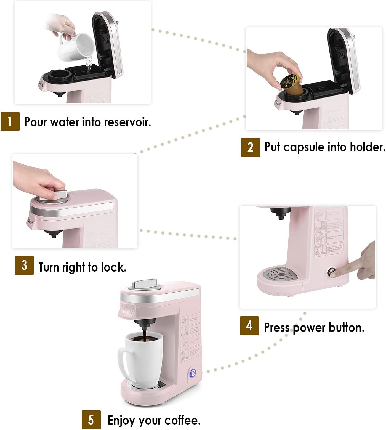 【SINGLE CUP COFFEE BREWER】 CHULUX single serve coffee maker compatible with 1.0 and 2.0 pod coffee capsules. Also suitable for use ground coffee (Included a black reusable filter ) to create your private cafe at leisure or busy moment. 【A QUICK COFFEE MAKER】800W heating element with rapid brewing technology by blue indicator light flash,also features auto shut-off preventing from overheating,keeping safe and help saving energy.One cup of hot brewed coffee will ready for you within 3mins. 【MUG SIZES COMPATIBLE】The coffee flows out is almost same as the water amount you poured in,ensure every fresh coffee by maximize utilization.The single coffee brewer supports for travel mugs up to 5.3"tall by removing drip tray. 【BUSINESS TRIP AND HOME USE】The compact size is perfect for trip or limited countertop.The portable mini brewer easy to carry anywhere,friendly for office,kitchen,guest room,hotel and RV. But only feasible for 120V voltage within 6000feet altitude. 【EASY TO CLEAN】BPA-FREE material for water tank and piercing needle. Detachable filter basket and drip tray can be removed and washed directly. A easy clean method by pressing button after adding in water and vinegar.