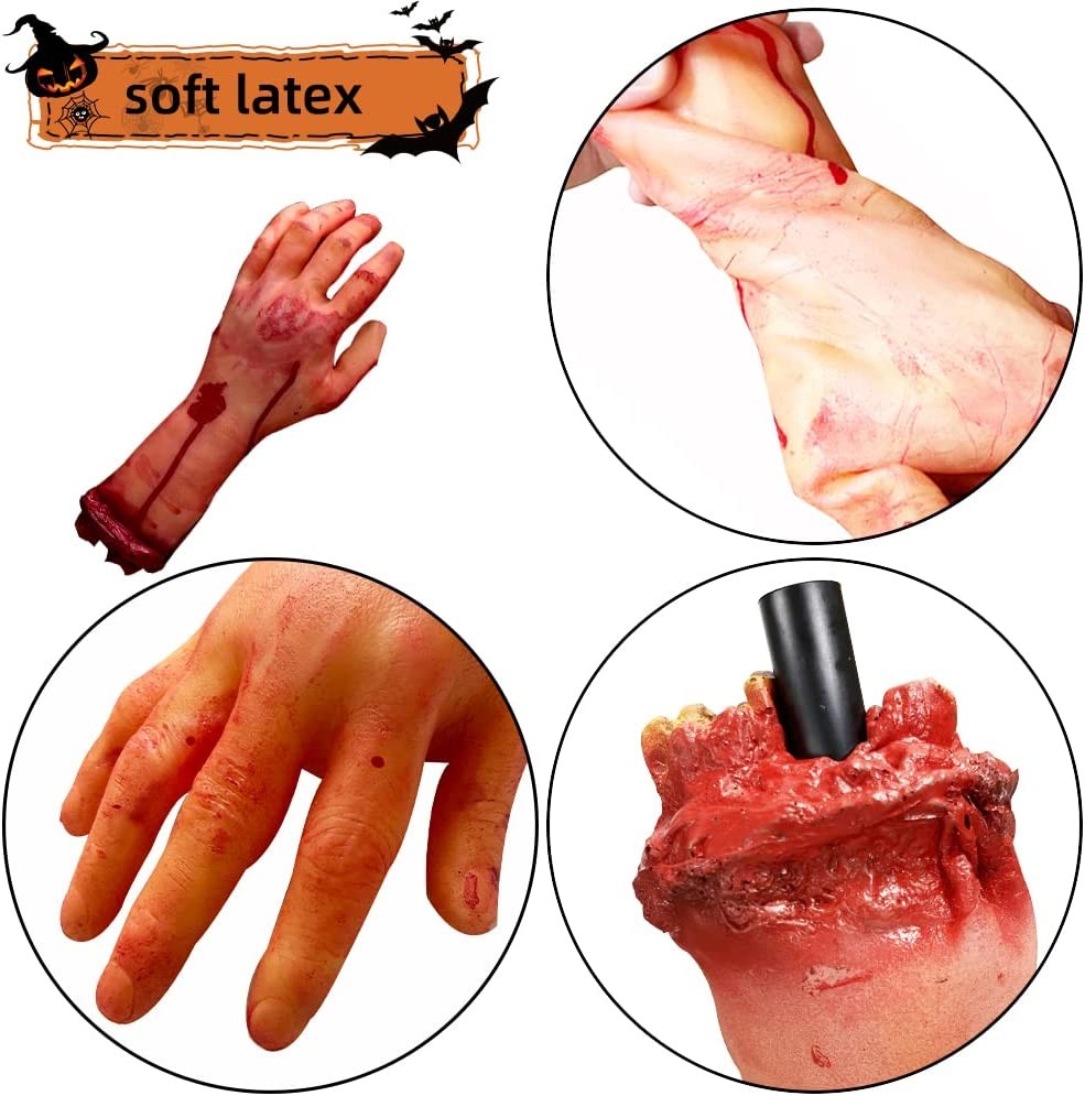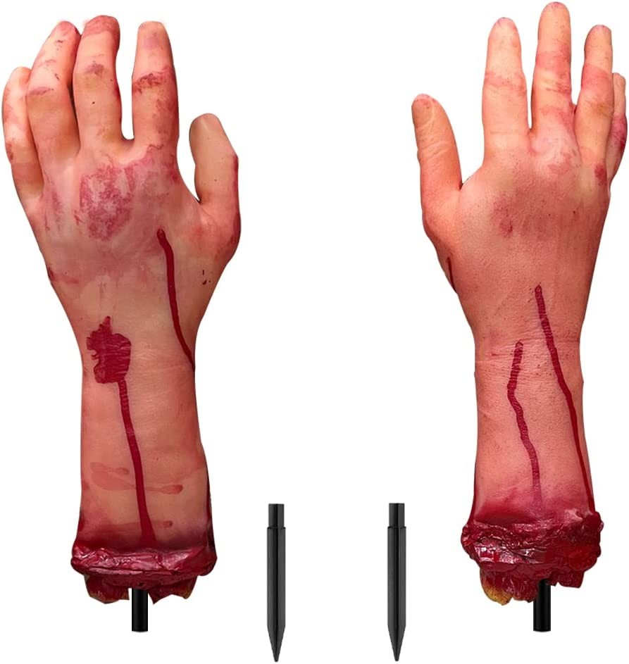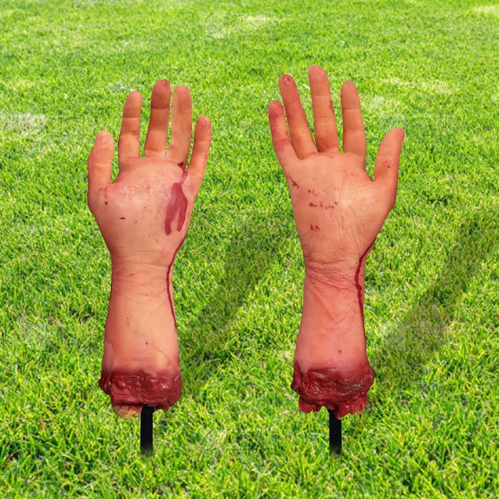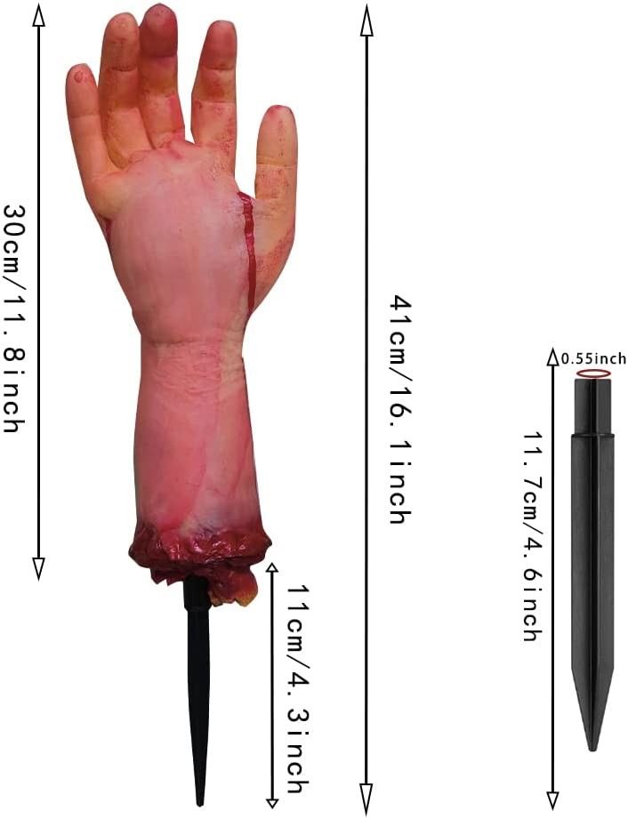 Durable Material:Durable Material:Realistic Hands Stakes Made with Environmental Rubber & PP Cotton,Sturdy and durable,Waterproof; for indoor and outdoor use. Set Includes:2 Fake Human Arm Hands,2 plastic yard stakes. 2 plastic connecting rods. Easy To Install:Combine the Halloween yard stakes with arm, insert them into the ground lawn or yard,and place them the way you like. Size: Arm measures 40cm/ 15.7 inches long,13cm/ 5.1 inches wide; Realistic looking for scary Halloween decorations SCARY DECORATION:Fake Human Arm Hands Bloody Yard Sign for Halloween Graveyard Decorations, Indoor and Outdoor Zombie Decorations, Halloween props decorations,haunted houses,stage props, magic tricks,April Fool props and more.