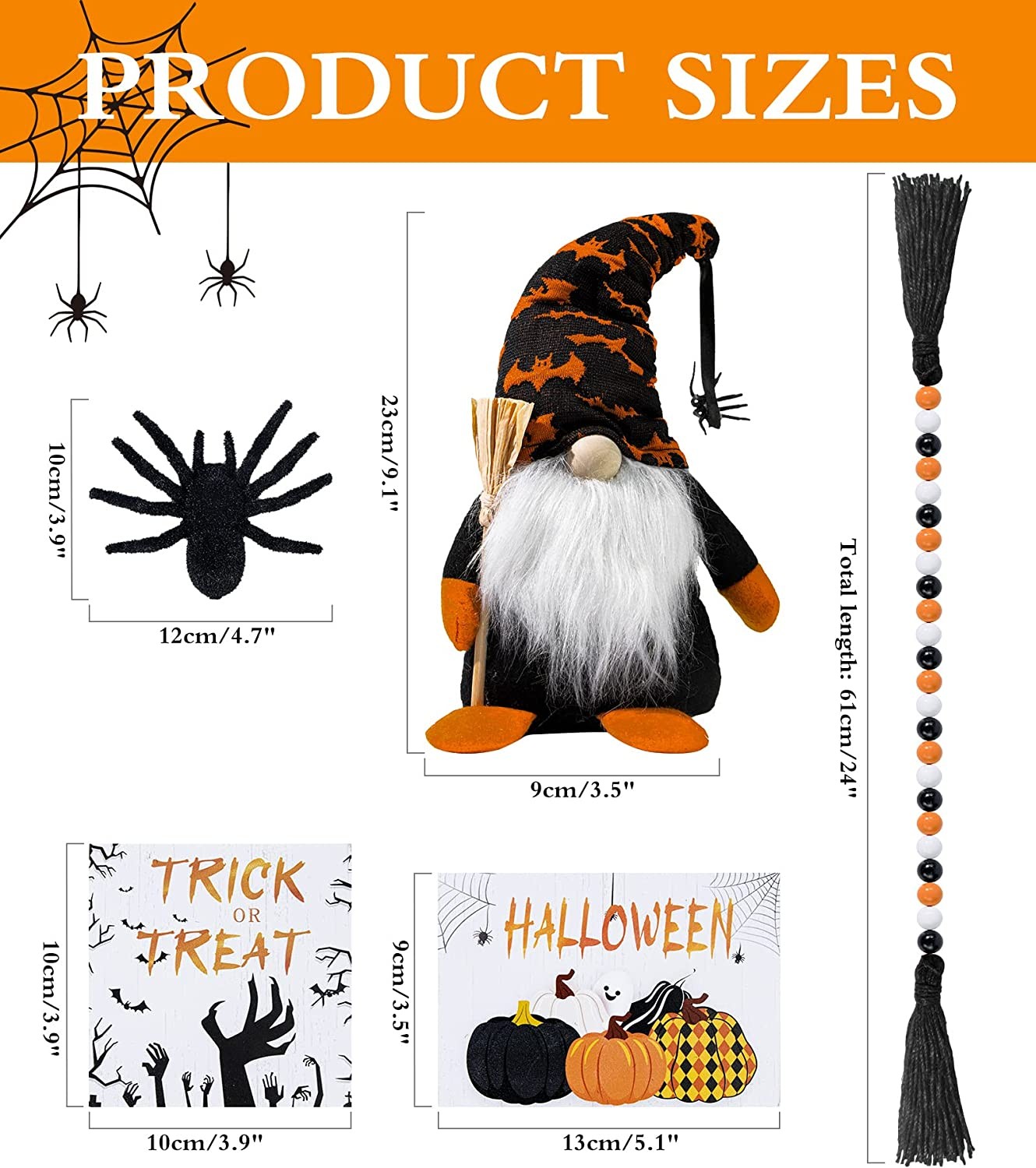 ?【Tiered Tray Decor Set】5 PCS exquisitely matched tray decorations: 1PC gnome plush doll, 1PC wooden bead garland with tassels, 1PC simulation nylon flocking spider, 1PC wooden pumpkin sign, and 1PC "TRICK or TREAT" wooden sign. Please NOTICE: that the tiered wooden tray is not included. ?【High Hardness Parts】The gnome tiered tray decor is made of soft felt and fiber beards, delicate and sturdy. Two Halloween signs and bead garland are made of natural wood, having high hardness, delicate patterns, and a smooth surface. The highly simulated spider is very realistic (A few srands of hair loss are normal). ?【Versatile Decorations】This Halloween tiered tray decor can be used in many ways from Halloween to art galleries, office receptions, props for school projects, and even backgrounds for photos. Will be able to be reused for future occasions or projects if treated well. ?【Perfect Halloween Decoration】The tiered tray decor set will be able to be used as table centerpieces, hung on walls, shelves, etc. This tray decoration set is filled with Halloween colors. The classic orange, black and white combination, is very easy to match and creates a strong Halloween atmosphere. ?【Safe and Sound】Delicate and ingenious design that most people will like. Halloween tiered tray decoration makes a great gift for Halloween, Christmas, and Thanksgiving Day, but also for housewarmings, birthdays, and more. In addition, for any quality problems, we will serve you 24 hours a day and ensure your enjoyment!