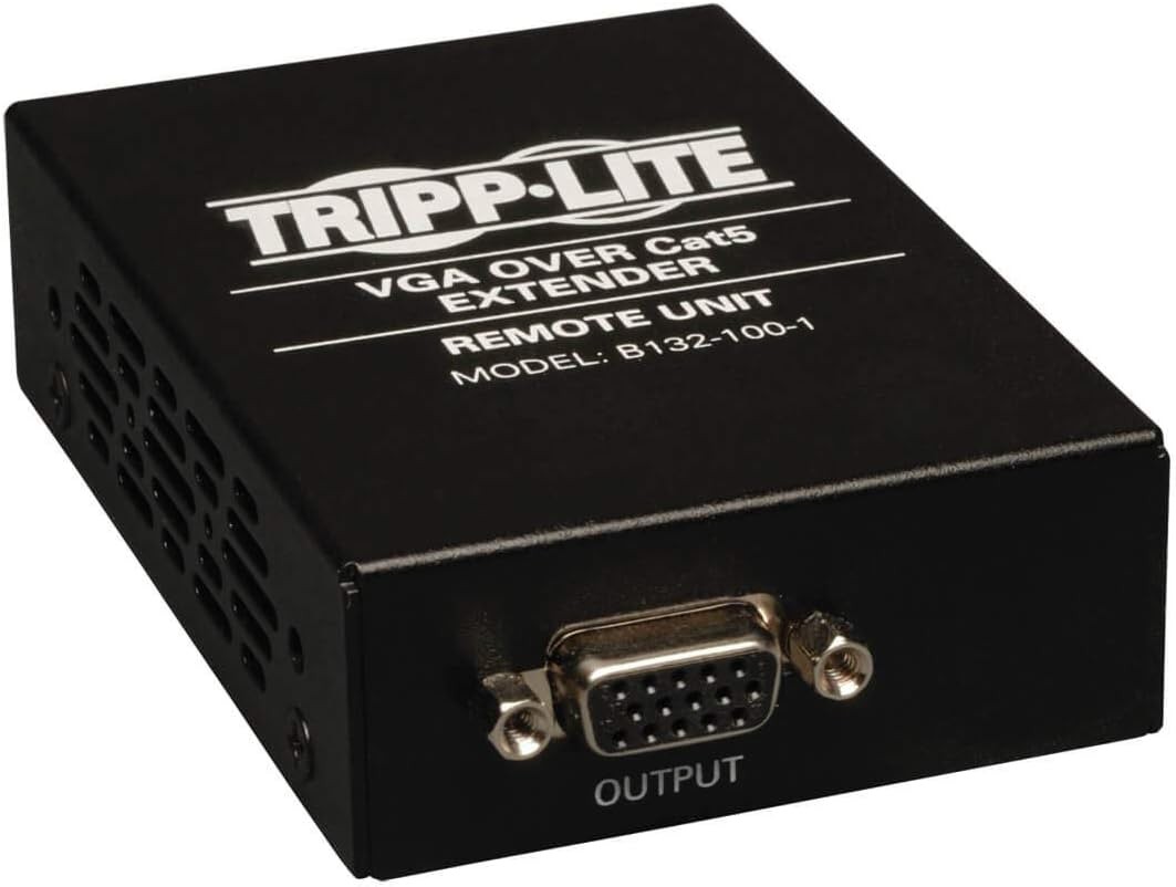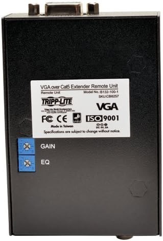 Supports a maximum resolution of 1920 x 1440 (60Hz) Works with a B132-002-1 or B132-004-1 local unit to extend a 1024 x 768 (60Hz) video signal up to 1,000 ft. when using 24Awg, Solid Wire Cat5e/6 cable For optimal image quality between 500 and 1,000 ft., use Zero-Skew cable, such as Tripp Lite P524-01K Features built-in Equalization and Gain controls to adjust the video image Includes mounting hardware that allows unit to be wall mounted, rack mounted or pole mounted Ideal for digital signage situations, such as retail, schools, churches, etc.. Compliant with the Federal Trade Agreements Act (TAA) for GSA Schedule purchases 1 year limited warranty.
