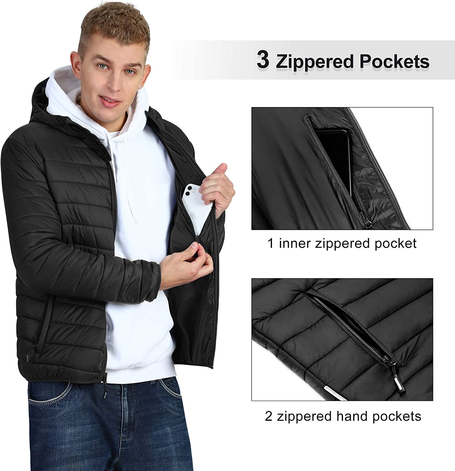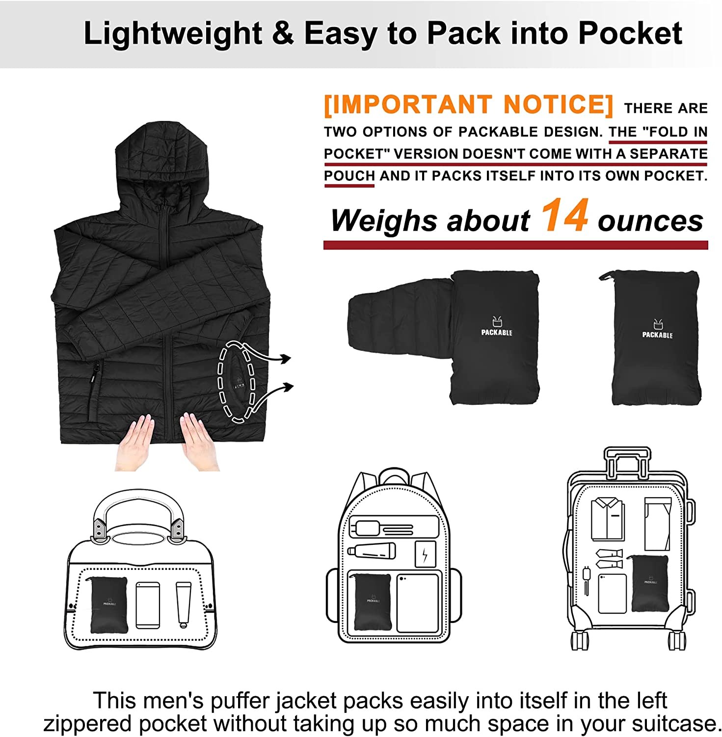 Shell & Lining: 100% Nylon, Filling: 100% Polyester [IMPORTANT NOTICE] There are TWO OPTIONS OF PACKABLE DESIGN. The "fold in pocket" version doesn't come with a separate pouch. But it packs itself into its own pocket and turns into a zippered bag as shown in the main image. This design helps you get rid of worries about losing this bag and problems with getting a spare one.If you want a storage bag to pack sepatarely instead, pls order the version (fold in Bag). Thank you for your attention here! Machine Wash Comfortable: Outdoor Ventures puffer jacket with hood features high-tech insulation to insulate cold air and retain warmth; The elasticized cuffs and hem of this winter coat can more effectively prevent wind from entering and make you warmer; Impeccable fit built to keep you protected in milder weather; Center-front zipper has zipper garage at chin for next-to-skin comfort. Humanized Design: Outdoor Ventures warm winter jacket with hood includes 2 outside zippered pockets and 1 inner chest pocket with zipper. It is great for storing money, keys, phone, wallet, passport etc, providing great privacy and convenience for you; Sleeves are a bit long, which will work well for tall guys. Warm Lightweight Winter Jacket: Outdoor Ventures full zip insulated jacket is versatile as a 3-season jacket in fall, spring and winter. This lightweight jacket featuring water-resistant fabric will keep you warm and dry in cold, damp weather without weighting you down, and it's easy to fit in your backpack with room to spare. Multipurpose: Our outdoor apparel suitable for casual wear, outdoor work, traveling, cycling, hiking, fishing, camping. A must for your wardrobe in spring, autumn and winter.It makes a perfect Birthday, Christmas, Valentine's, Father's and Thanksgiving Day gift, too.