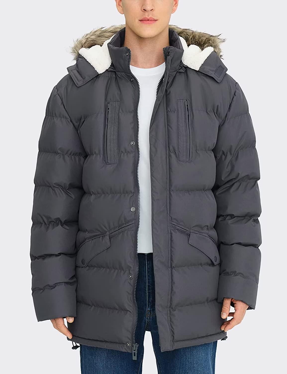 Polyester Imported Zipper closure Machine Wash 【Water Resistant】Water-Repellent shell fights bad rainy or misty weather, keep your body dry and comfortable. 【Mid-Length Coats】Medium length coats for better coverage and heat retention to keep you warm and stylish. 【Excellent Thermal Insulation】Mens winter coats quilted with thicken cotton and lambswool fleece lined for added warmth and come with high-quality windbreak fabric which is smooth to the touch. 【Functional Pockets】2 side pockets,2 zipper pockets and 1 inner hidden pocket to keep personal stuff safe and hands warm. Windproof hood with drawcord and stand collar can be adjusted for a customized fit. 【OCCASION】Perfect for casual daily wear, work, travelling, hiking, camping, skiing, snowboarding and other outdoor sports activities in winter or cold weather.