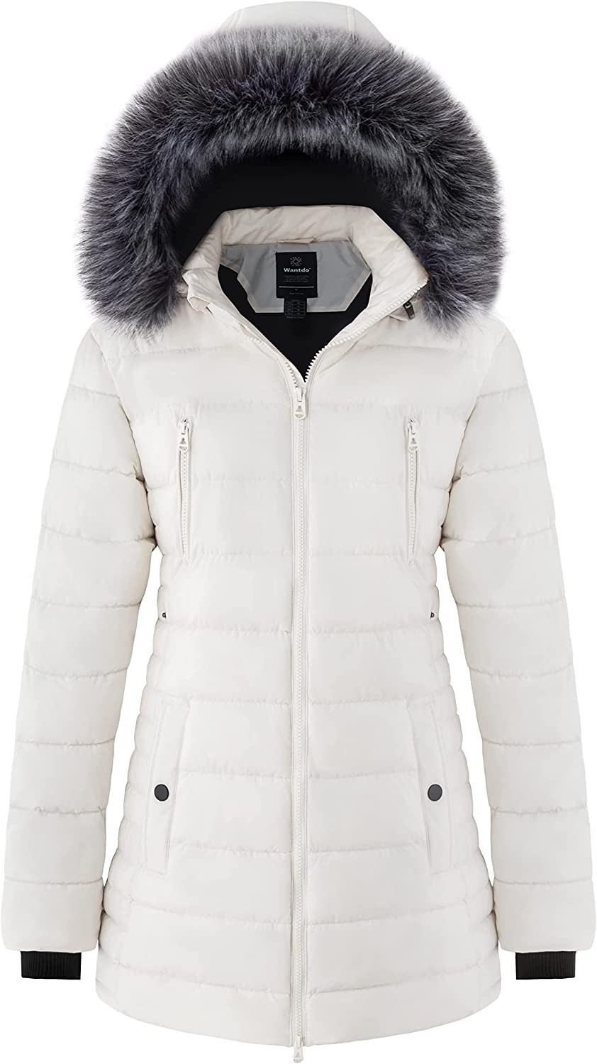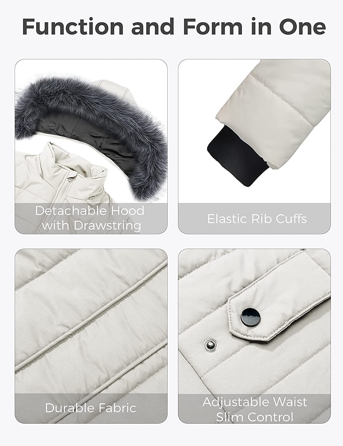 100% Pongee Zipper closure Cold & Wet Protection - Made with an anti-water fabric shell, filled with synthetic insulation, this quilted parka jacket keeps you dry in the rain or warm in snowy weather at all times! A Warm Embrace - The waterproof snow jacket seals body warmth in and keeps cozy. These winter coats for women are made with soft and light filling, a diamond pongee lining, and an adjustable fur-lined hood Full Body Protection - Protect yourself against wind, snow, and rain with a thick warm jacket. These fur coats for women are made with a detachable hood and fur lining, elastic waist, snap-button cuffs, DWR finish, and PU membrane A Parka Coat You Can Trust - This quilted puffer jacket is tailored using heavy-duty buttons and zippers that can be secured without a hitch. And the insulated padded jacket's durable outer shell protects against tears and abrasions Made for Women - Each of these puffer coats boast 6 pockets that keep essentials within reach. A waist buckle of the women's zip-up jacket creates a figure-flattering silhouette despite the loose hood, sleeves, and hem
