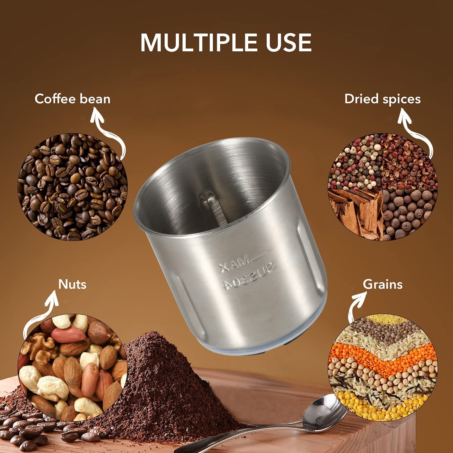 【Grind Your Favorites!】: The sharp blade chops ingredients through rapid spinning, it not only works well with coffee beans but also works with other ingredients, like dried spices, nuts, herbs and grains. No need to buy another grinder to take up your counter space.