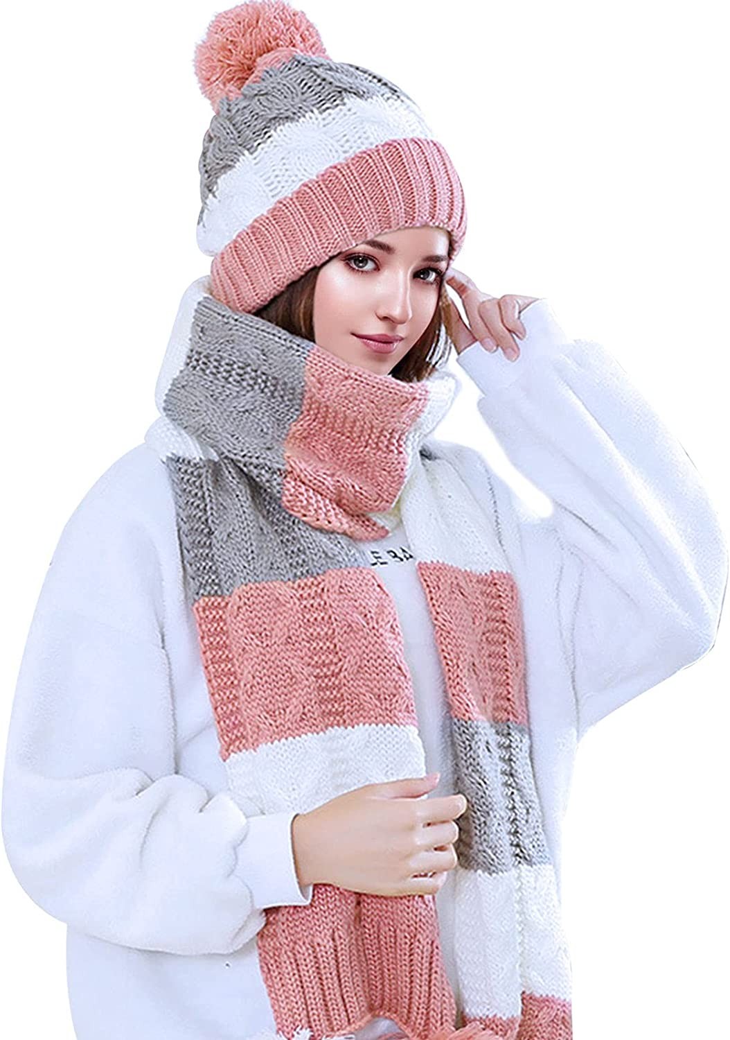 Fleece Lining to Keep Warm: the double-layered winter skull cap is lined with thick fluff. The long scarf and gloves have a soft and thick knitted outer layer. Provides all-round warmth to keep your head, face, ears and neck warm and resist the wind and cold. The long scarf can cover the face like a bib to prevent cold wind from forming on the face, neck, chin and ears, making it soft and comfortable.