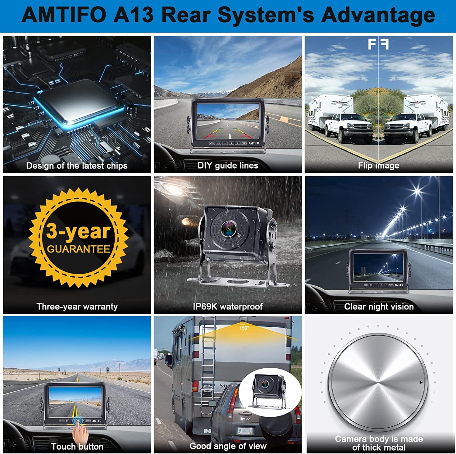 Backup camera for truck is easy installation,Once you connect the display to the supply power in the cigarette lighter, or wire it to the ignition you will get the image. The back up camera systems for car with super large 7 inch monitor, it has capability to monitor two video inputs V1/V2, one license plate backup camera or rv backup camera can be added to the system. V2 video input will have priority (reverse camera) for safety. Trailer backup camera a multi-tasker that offers clear graphics at an affordable price. High definition resolution that offers clear picture quality even at night.150 degree, wide viewing angle provides you larger visible area for safety. lity even at night. Trailer backup camera a multi-tasker that offers clear graphics at an affordable price. High definition resolution that offers clear picture quality even at night.150 degree, wide viewing angle provides you larger visible area for safety. lity even at night. AMTIFO A13 car camera provide 30-day money-back guarantee and 2-year warranty. Replacement service and free tech support; we know you will be pleased with the backup camera. Also bracket adapter compatible furrion pre-wired bracket can be provided according your need