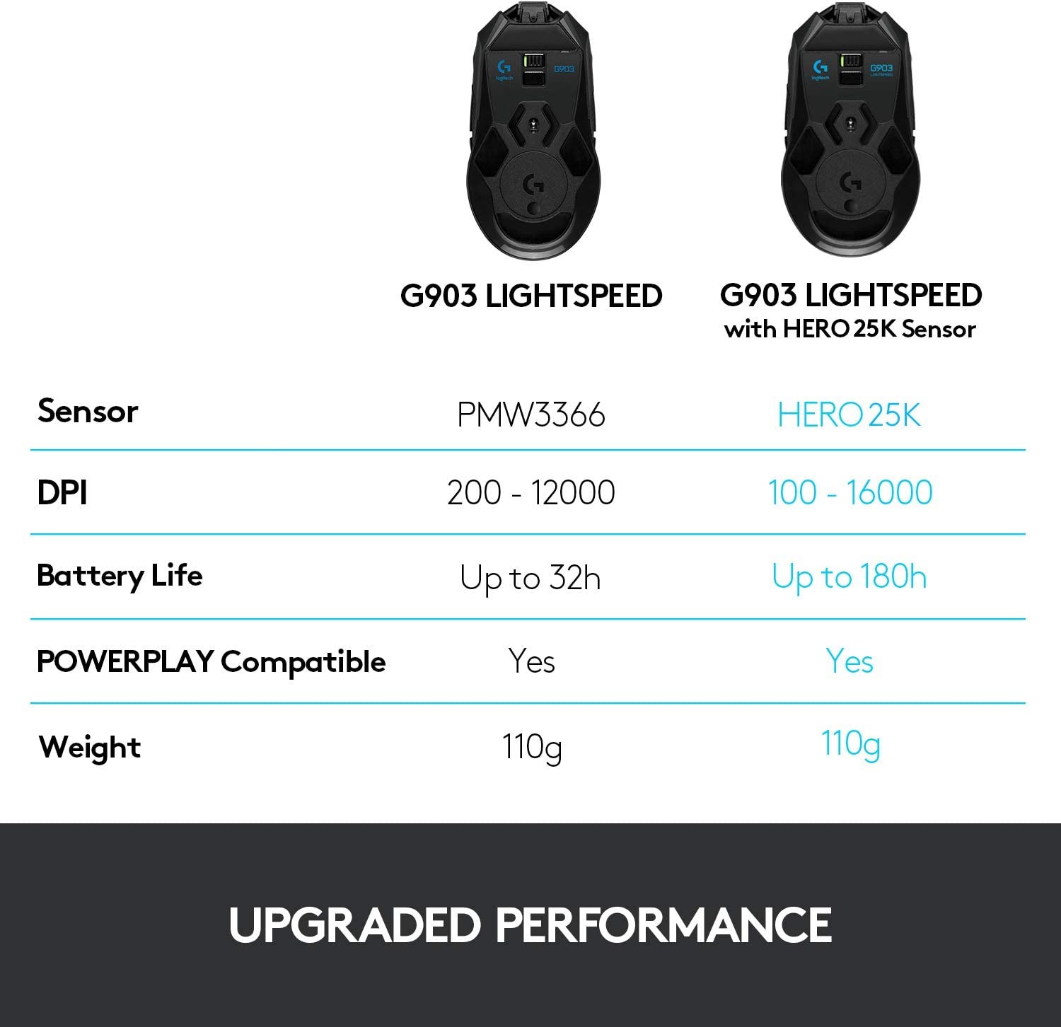 Power play wireless charging: never worry about your battery life again. Add the power play wireless charging system to keep G903 and other compatible g mice charged while at rest and at play. Powerplay wireless charging system sold separately Hero 25K sensor through a software update from G HUB, this upgrade is free to all players: Our most advanced, with 1:1 tracking, 400 plus ips, and 100 - 25,600 max dpi sensitivity plus zero smoothing, filtering, or acceleration Light speed wireless: pro-grade 1 ms report rate, no cable drag, no compromises on weight or battery life; eSports professionals depend on lightspeed’s responsiveness and reliable Connectivity 140 Hour lipo battery: super-efficient system design results in almost 6x the battery life of previous Gen; lasts for up to 140 hours with light Sync RGB lighting, and up to 180 hours without