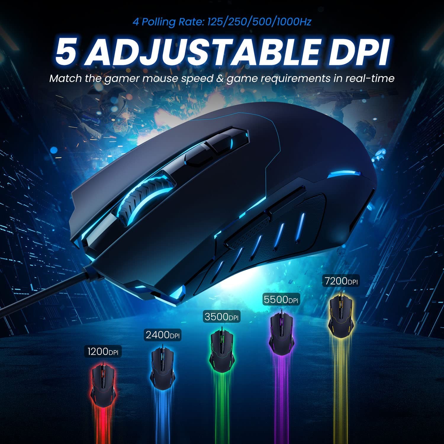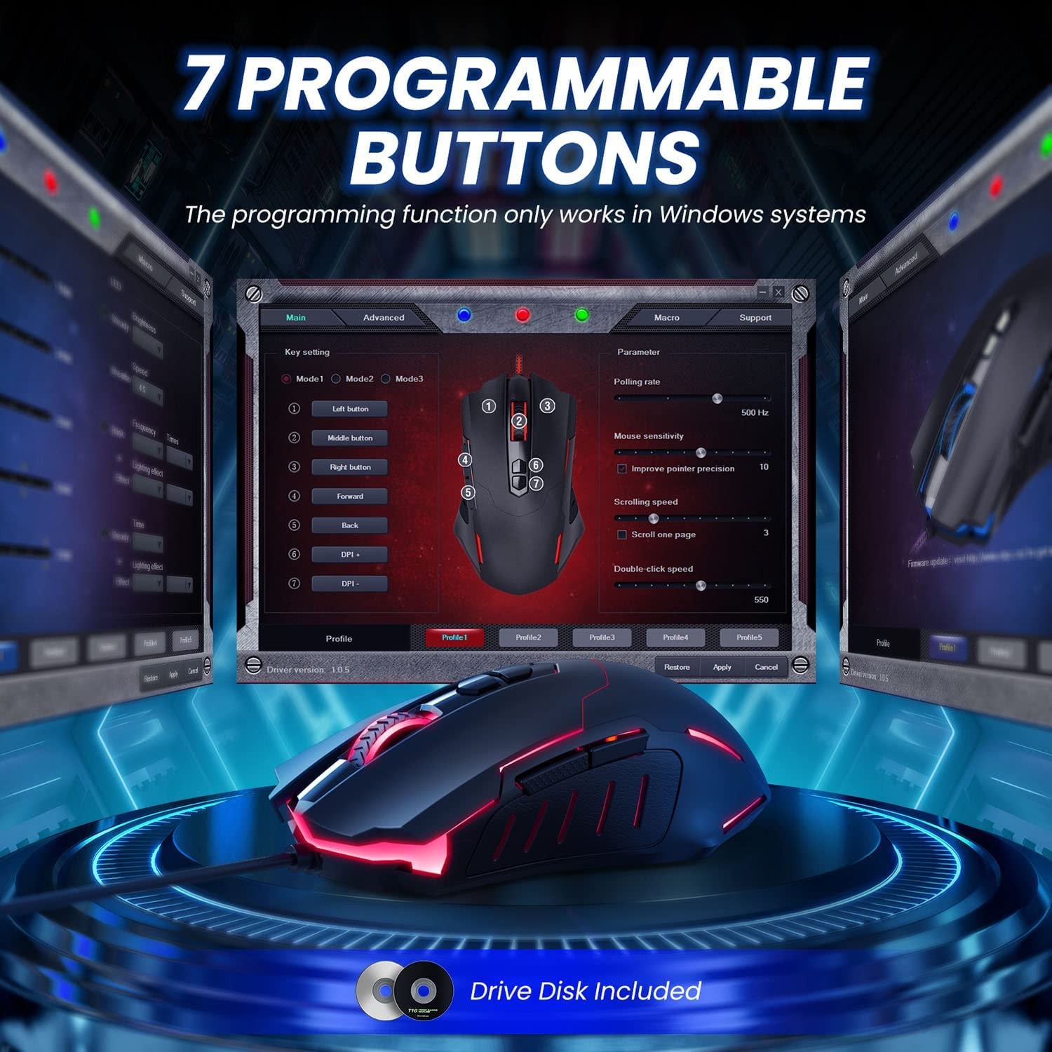 【High-Precision Adjustable 7200 DPI and 4 Polling Rate】Default 5 DPI levels available from 1200/2400/3500/5500/7200 DPI, meet your multiple needs, either for daily work or gaming. Use DPI switching to match the gaming mouse speed and game requirements in real-time, quickly adjustable for different gaming scenarios. 4 polling rate is adjustable: 125Hz/250Hz/500Hz/1000Hz, polling rate ensures smooth and high-speed movement, up to 1000Hz makes it faster and more accurate than ordinary mouse. 【16 Million Breathing LED Backlit】The 16 million lighting "breathing" backlight setting puts you in a unique gaming ambiance and enhances your gaming pleasure. 5 default colors, other colors need to install software settings. You can personalize the color of the DPI according to your needs. A convenient switch on the bottom makes it easy to turn the backlight off and off. 【ALL Mouse Buttons Programmable】Support macro editing, 7 mouse buttons can be programmed by the installing software which makes the wired mouse more intelligent and meets more demands for different games. Great value and control FPS gaming mouse, also excellent for MOBA/ RTS games. (Driver Disk included) Compatible with Windows 10, Windows 8, Windows 7, Windows XP, Vista, Linux, etc. ( Note: no programming function for Mac system.) 【Ergonomic Design Less fatigue】Tmaine gaming mice with symmetrical & streamlined and provides a comfortable claw-grip design, and long-term use without fatigue. A 1.8m USB cable is long enough for normal computer use. 【Reliable Quality & Free Lifetime Support】With high-quality ABS materials, intricate polish manufacturing processes and meticulous assembly guarantee the functional reliability of the mouse for years. Whether are targeting, targeting, chopping, or attacking, this professional optical led mouse will be your ideal companion. (Note: The driver can be downloaded from our website, PLEASE check out the user Manual.) Batteries Required: False Target gender: unisex Age range description: Adult Power source type: Corded Electric