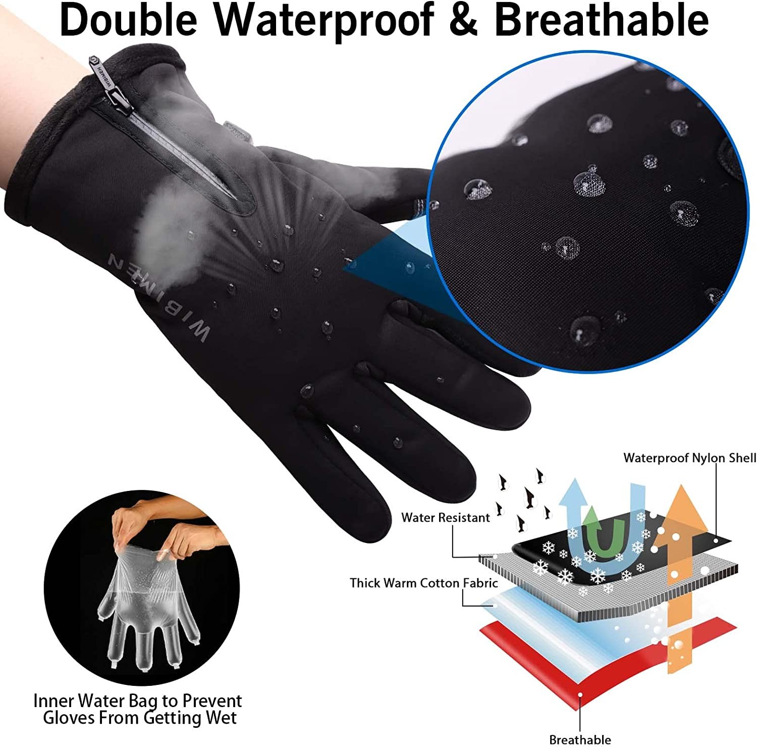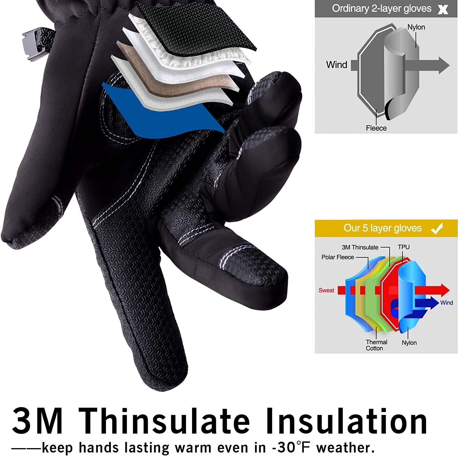 【Upgraded Touch Screen】: The winter waterproof gloves coated with larger non-slip PU touch conductive leather extent to the finger tips. The touch screen capability on fingertip allows you to typing easily without taking off the gloves. And you can use touchscreen devices unhindered with the upgraded sensitivity of touch screen capability on the pad of the finger. 【Warm & Comfortable】: The snow gloves are constructed with multiple layers of super-efficient Thinsulate insulation, ensuring breathability and maximum heat retention. They are lightweight enough to ensure optimal mobility and dexterity. The cold weather gloves insulates with 5-layer thermal softshells, which are suitable for icehouse or all kinds extreme winter conditions. Maximum cold resistance temperature up to -10℉. 【Double Waterproof & Breathable】: Waterproof and moisture-wicking TPU membrane insert in waterproof gloves, which ensures maximum dry comfort and breathability so even if you have to endure sweaty,damp,cold or even humid conditions,sweat is released so that your hands remain dry. 【Humanized Design】: Snowboard gloves with the adjustable non-shaking sports waterproof zipper on the wrist can make gloves easy to slip on and off, accommodate for differing wrist thickness, and effectively lock the temperature ; Anti-lost buckles keep winter gloves together when not wearing. 【Ideal for Winter Activities】: The ski gloves excellent for cold weather while skiing,snowboarding, snowmobiling,sledding,riding,cycling, running, dog walking, hiking, climbing, driving, fishing, shoveling snow or other outdoor winter activities. A great gift choice for friends and families.