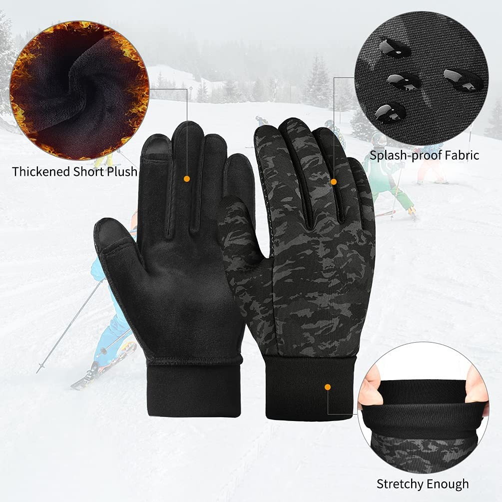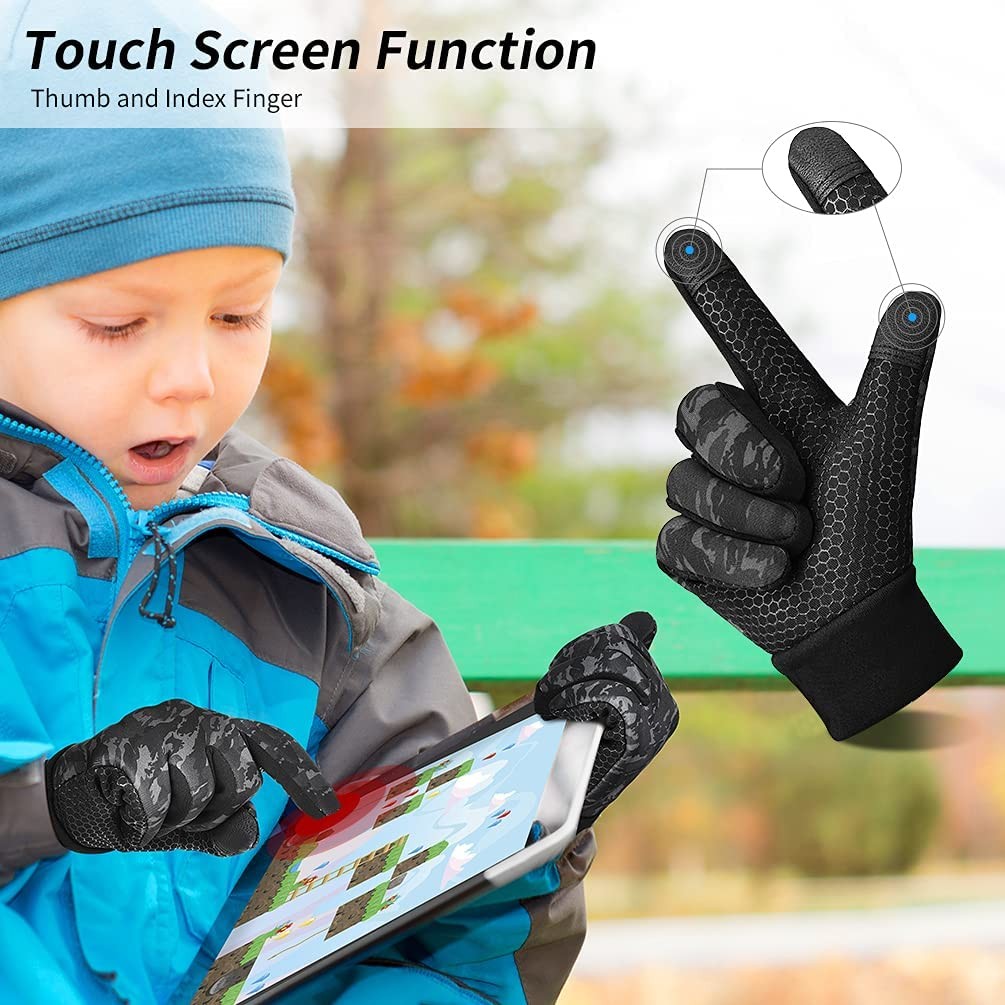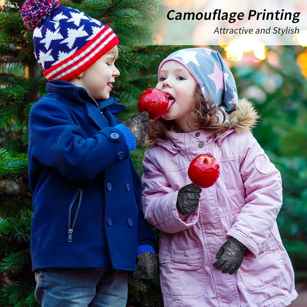 Soft & Thickened Warm Gloves: Kids winter warm gloves linings are made of thickened short plush. These kids winter warm gloves with high softness can keep your kid's hands warm and offer a snug fit at the same time Windproof & Splash-proof: Kids winter gloves are made of milk fiber and SBR composite. These kids winter gloves can prevent their hands against cold wind. The elastic cuffs of are able to block the cold wind and lock the heat. Splash- proof Fabric prevents your kids from getting hands wet in rainy or snowy days and keep warm Sensitive Touch screen Function: With 2-finger touchscreen function on the thumb and the index finger, our Kids Winter Touchscreen Gloves allow kids to use electronic devices or take online classes with the gloves on. A wonderful gift for kids in chilly winter Anti-slip palm & Camouflage Printing: This kids winter sport gloves are designed with honeycomb silicone on the whole palm, which can increase the friction of this sport gloves. The backs of our Winter Running Gloves are printed with classic camouflage patterns, making the Running Gloves a great addition to kids' outfits. Suitable for both boys and girls Versatile Winter Kids Gloves - These sports gloves is good for indoor and outdoor use. In doors, your lovely kids can use tablet with gloves on their hands. Out of doors, they can use this winter gloves as a hiking gloves, running gloves or cycling gloves. There are 3 different sizes available. S is 6-8 years old kids gloves, M is 8-10 years old kids gloves, L is 10-12 years old kids gloves. If your kid's hands are larger than those of the same age, it is recommended to buy one size larger