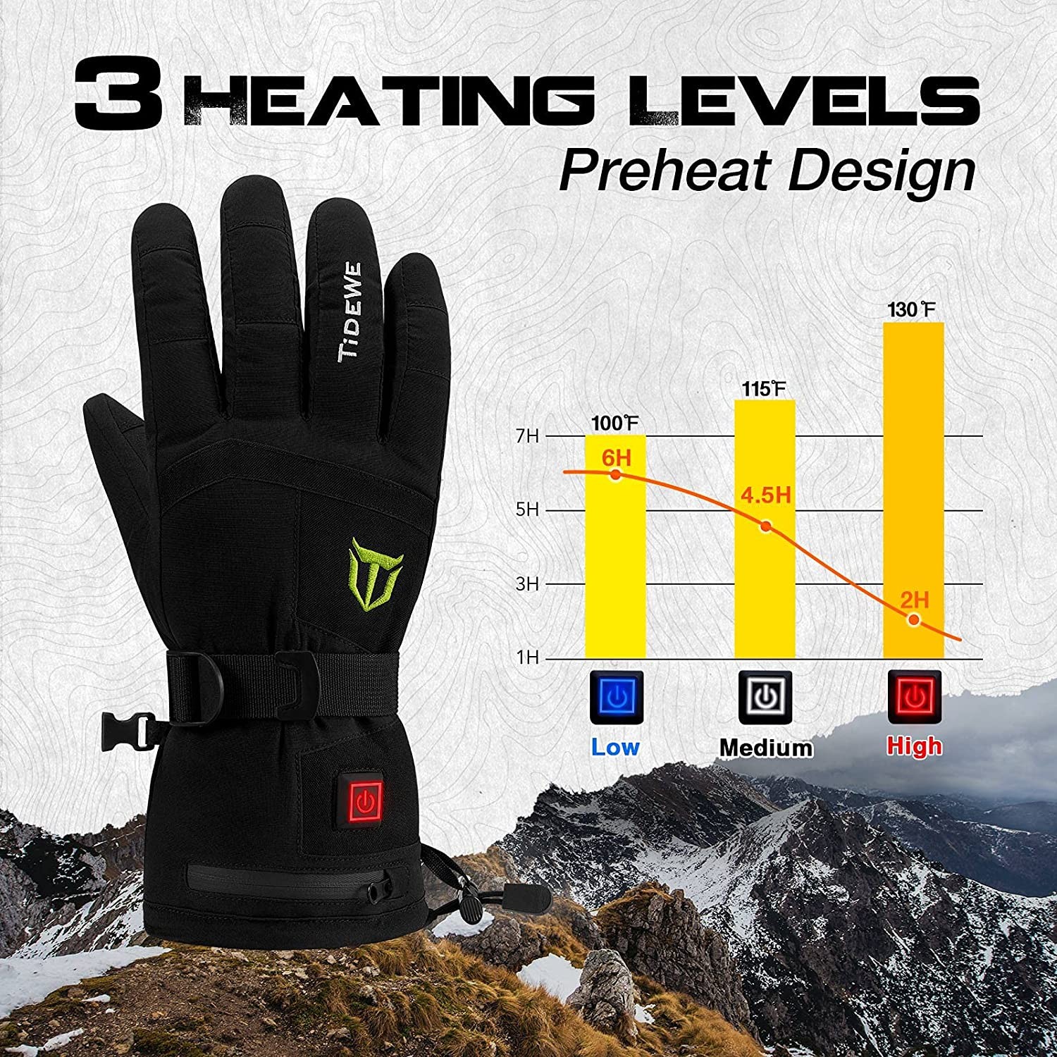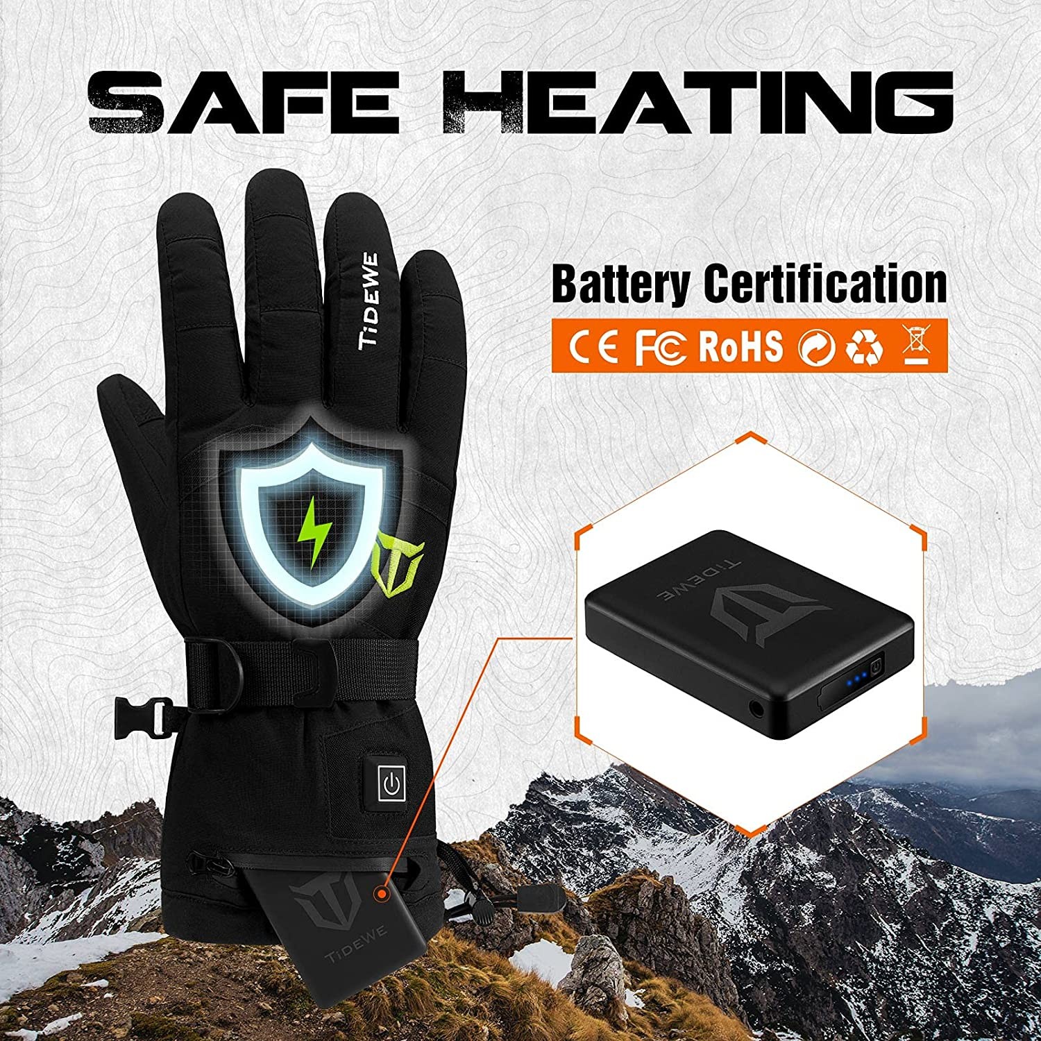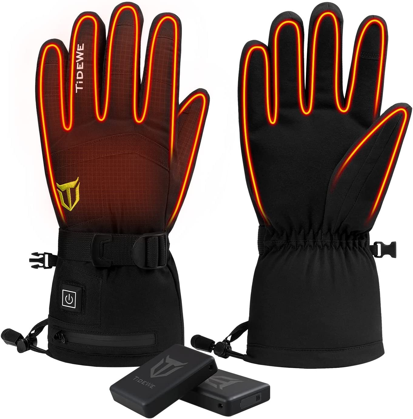 【Smart Temperature Control】TIDEWE heated gloves features 3 adjustable heat settings (blue means low, white shows medium and the red indicates high) with just a simple press of the button, which makes it easy for you to adjust the temperature according to your needs, delivering your comfort in cold conditions. 【Long Lasting Warmth】The TIDEWE rechargeable heated gloves can be Fully charged in 3-4 hours; quick charge is only 2 hours. Up to 6 working hours on the lowest setting, 4 working hours on medium, 2 working hours on high. The maximum temperature is 131℉ in the high setting, which ultimately keeps hands warm, even at 32℉. The high-quality cotton still keeps your hands warm even without turning on the heating system. 【Waterproof, Breathable & Safe】Our cold weather gloves are made of insulated, fleece, water repellent (DWR) and windproof material. They are not bulky, but breathable, and the waterproof zipper keeps your hands dry and comfortable. TIDEWE heated gloves applies the battery with UL, FCC, RoHS, CE certification, keeping you warm and safe at the same time. 【User Friendly Design】Screen touch tips on the index fingers provide you the ability to answer your phone at any time without taking the thermal gloves off. Adjustable-buckle wrist strap and drawstring closure prevent snow or cold air from creeping in. Our sturdy turn fur palms gloves combine a soft lining and grip and comfort you expect from a premium glove.The finger and palm surface are designed according to the scture of the human palm to make it more comfortable. 【Best for All Outdoor Activities】TIDEWE Heating gloves can be used in any cold weather environment with quick charge and up to 6 hours working by portable-convenient power bank. You can stay warm in all outdoor activities like skiing, hiking, hunting, ice fishing, cycling, snowmobile, camping, mountain climbing and even doing outdoor work.