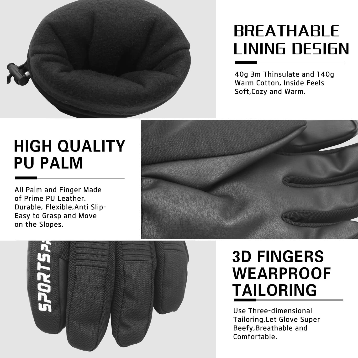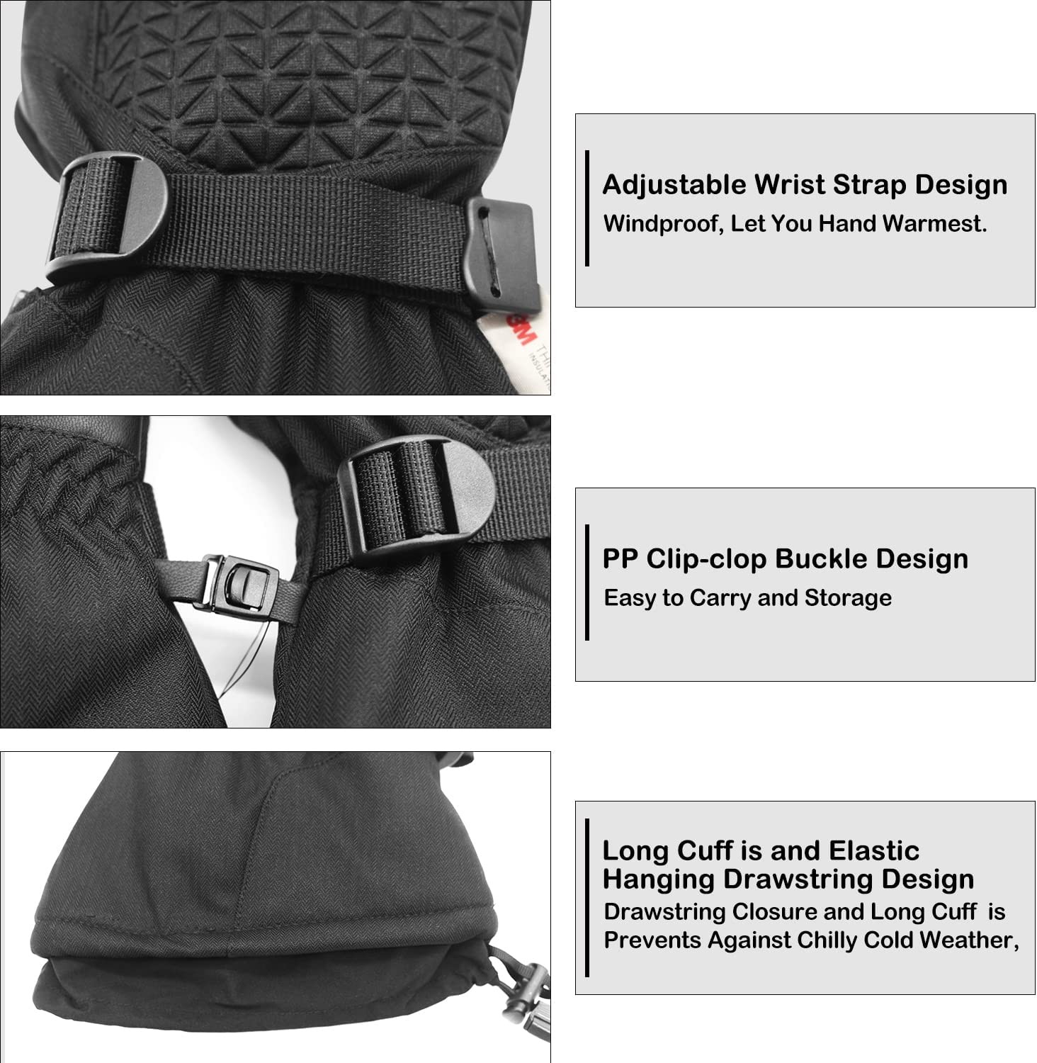 【①WARMEST 3M THINSULATE INSULATION:】 Insulated with 40 grams 3m thinsulate and 140 grams warm cotton.It is thick enough to keep hands warmth in cold chilly weather and water proof membrane lining insert warmest for extreme cold weather. 【②HIGH QUALITY TPU FAN-TEX WATERPROOF MEMBRANE:】Water proof membrane lining insert, snowproof,windproof,Moisture-wicking and Air-circulating interior ensuring breathability.99.99% water resistence.If you get a non-waterproof gloves,we will refund full money. 【③ANTI-SLIP PU PALM AND COMFORTABLE LINING DESIGN:】 Anti slip PU leather palm for better grip on the slopes,well wind resistence performance.Meantime super beefy and durable, flexible, mobility - easy to grasp and movement.The lining is very soft and comfortable for skin touch.If u one,you will need it in cold weather above -4°F. 【④BEST WINDPROOF LONG CUFF DESIGN:】 Adjustable wrist strap and elastic under wrist make it fit for you perfect,Hook and loop closure make it easier to carry on. 【⑤MULTIFUCTIONAL IN WINTER SPORTS:】Such as casual use, skiing, snowboarding, snowmobiling, sledding, snow-blowing, shoveling snow, downhill backcountry ski, ice climbing winter outdoor snow sports and so on.