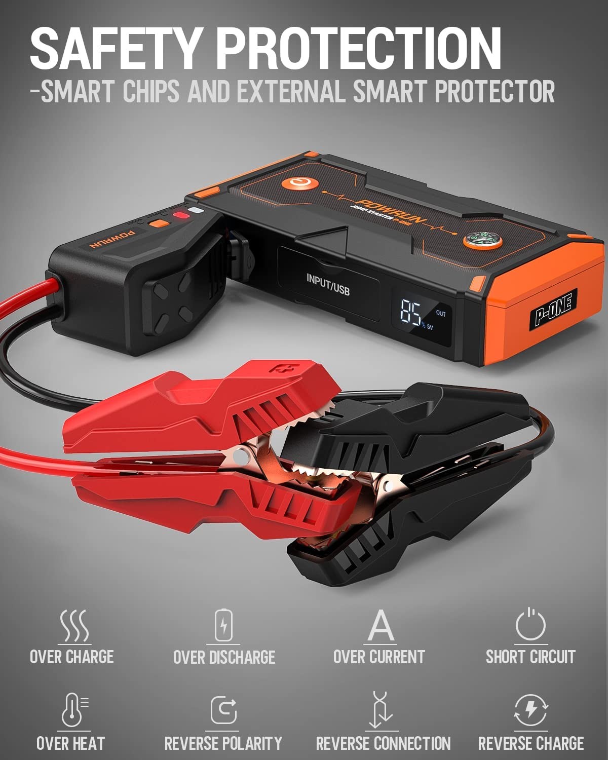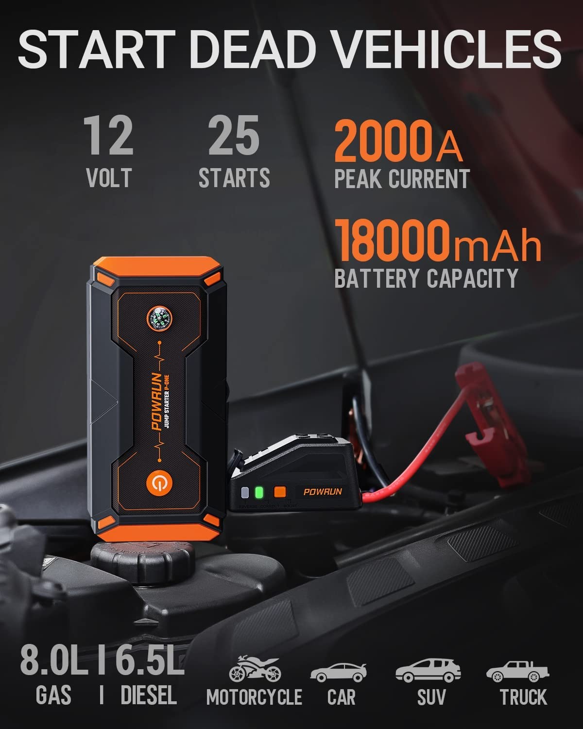 POWERFUL JUMPING PERFORMANCE - 2000-Amp car jump starter can quickly start a depleted car battery, up to 25 times on a single charge. Even if the battery voltage is too low (below 9V), pressing the “BOOST” button will force the car to restart. The Powrun jump starter battery pack can start up to 6.5-liter diesel and 8.0-liter gasoline engines and is suitable for cars, SUVs and trucks with a 12V battery. INTELLIGENT SECURE PROTECTION - Our Powrun battery jump starter has more than 8 types of protection, combined with excellent conductivity and heavy duty clamps with tension for fast and safe start-up of a dead car battery even in extreme environments from -4°F to 140°F. The P-ONE car starter has a prompt indicator and a buzzer to indicate correct operation. 4 IN 1 ROAD TRIP KIT - P-ONE is a portable car jump starter, 18000mAh portable mobile power, LED emergency torch and 12V DC auto accessories powered device. The USB port allows charging of smartphones or tablets etc.; The built-in 4-mode LED light to help you in the dark or in emergencies; In addition, P-ONE can provide power for 12V DC car accessories as tire inflators, car vacuum cleaners, etc. PERFECT DESIGN - Powrun battery jump starter with digital LCD screen for a clear view of the car starter’s usage status and remaining charge; the rubber covered molded case is durable and offers waterproof (IP65), dust-proof and shockproof outdoor protection. WHAT YOU GET - Powrun P-ONE Jump Starter, Smart Jumper Clamp, Wall Charger, Cigarette Lighter Adapter, USB Cable, EVA Storage Case , User Manual, 2-Year Warranty.Please contact us for help if you have any questions, we will reply to you in 24 hours.