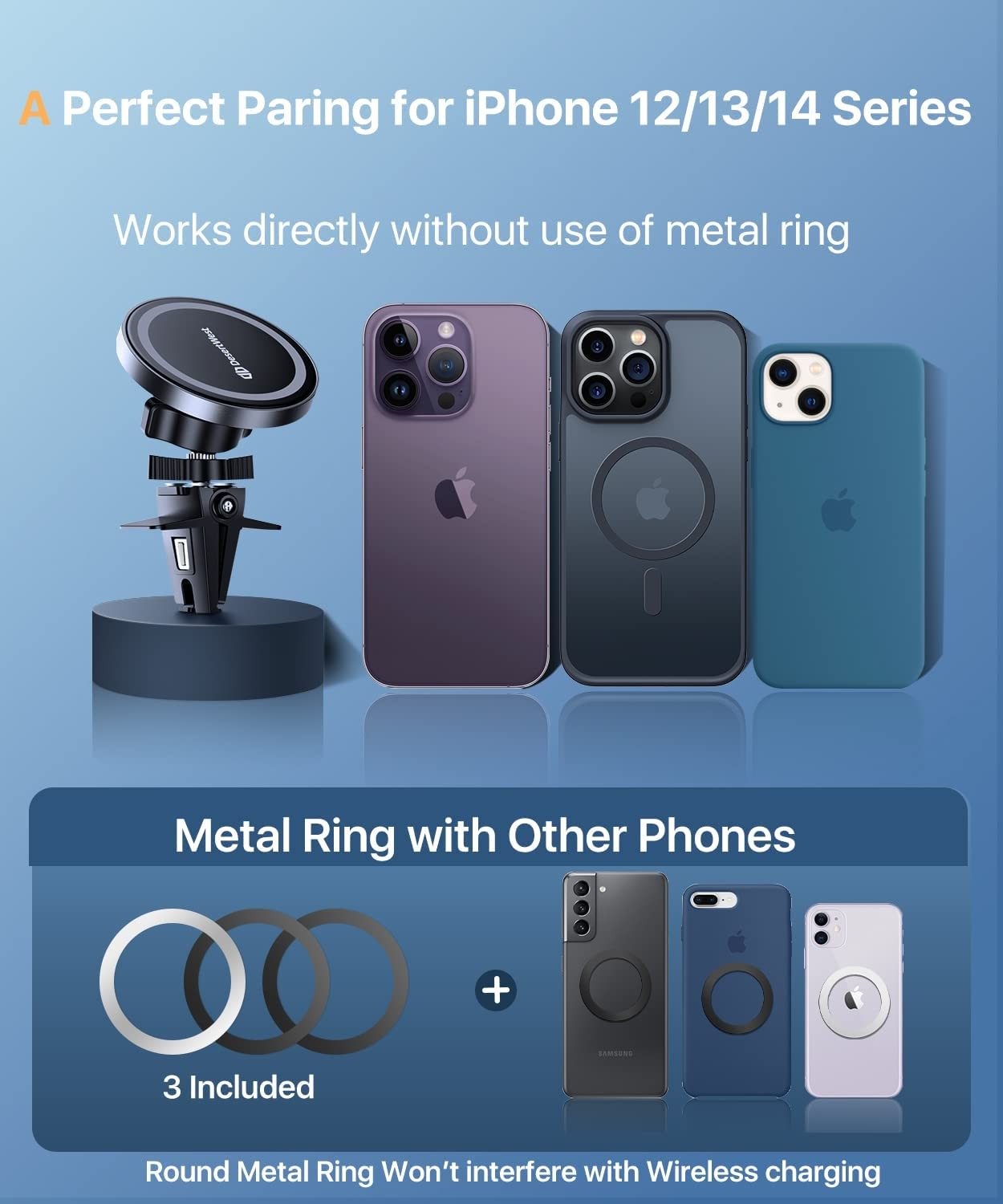 ?【Never Slip, Always Secure】 For the past five years, over 45,000 users have chosen our magnetic phone mount as their go-to solution for a balance of simplicity and strength. With 12 N55 paramagnets, known as the "Kings of Magnetism," you can trust that your phone will stay securely in place while you're on the road. No more worrying about accidental drops. ?【Universal Compatibility】 Designed to work seamlessly with all types of phones and cases, our mount even supports magsafe or wireless charging. For iPhone 12/13/14 series, the magsafe car mount eliminates the need for any metal rings, preserving the original beauty of your phone. For all other devices, simply attach the included metal ring (in three sizes) to your phone or case in just one minute. ?【Seconds to Mount, Easy Use】Mounting your phone in your car has never been easier! With our car mount clip, all you need to do is attach it to a horizontal or vertical air vent and tighten the screw knob. It takes just 10 seconds to set up and it's easy to transfer to another car.Plus, Our 6 cm mount design allows for more space for vent airflow than older models. ?️【All-Round Protection for Every Corner】Your Phone and your car’s every corner are being well taken care of. After engineering and testing in thousands of rigorous lab tests to achieve the 5A+ standard, we utilize advanced silicone where the mount is in contact with the car surface, offering superior protection. Double Twisted Lock with Reinforced chip hold with Air Vent securely and nicely. ✨【Cute Size, Never Block View/Airflow/Signal】The powerful magnetic car mount requires only 6 cm of space. You can still fully enjoy the air vent in winter and summer. It also takes only 6 cm from the center of the phone, ensuring that no signals or buttons are blocked. With 360 degree rotation, it is also useful for video recording. 360° rotation provides flexible view angle, which enhance driving safely and easy to using Waze/Maps for navigation. ?【Professional Team and Lifetime Support】With five years of product development, we are committed to offering you a highest-quality product. Our customers frequently comment that “the real product is better than the photos” and have a repurchase rate of 98%. Please feel free to contact us via the Amazon Message Center for any questions or issues. We are dedicated to your satisfaction.