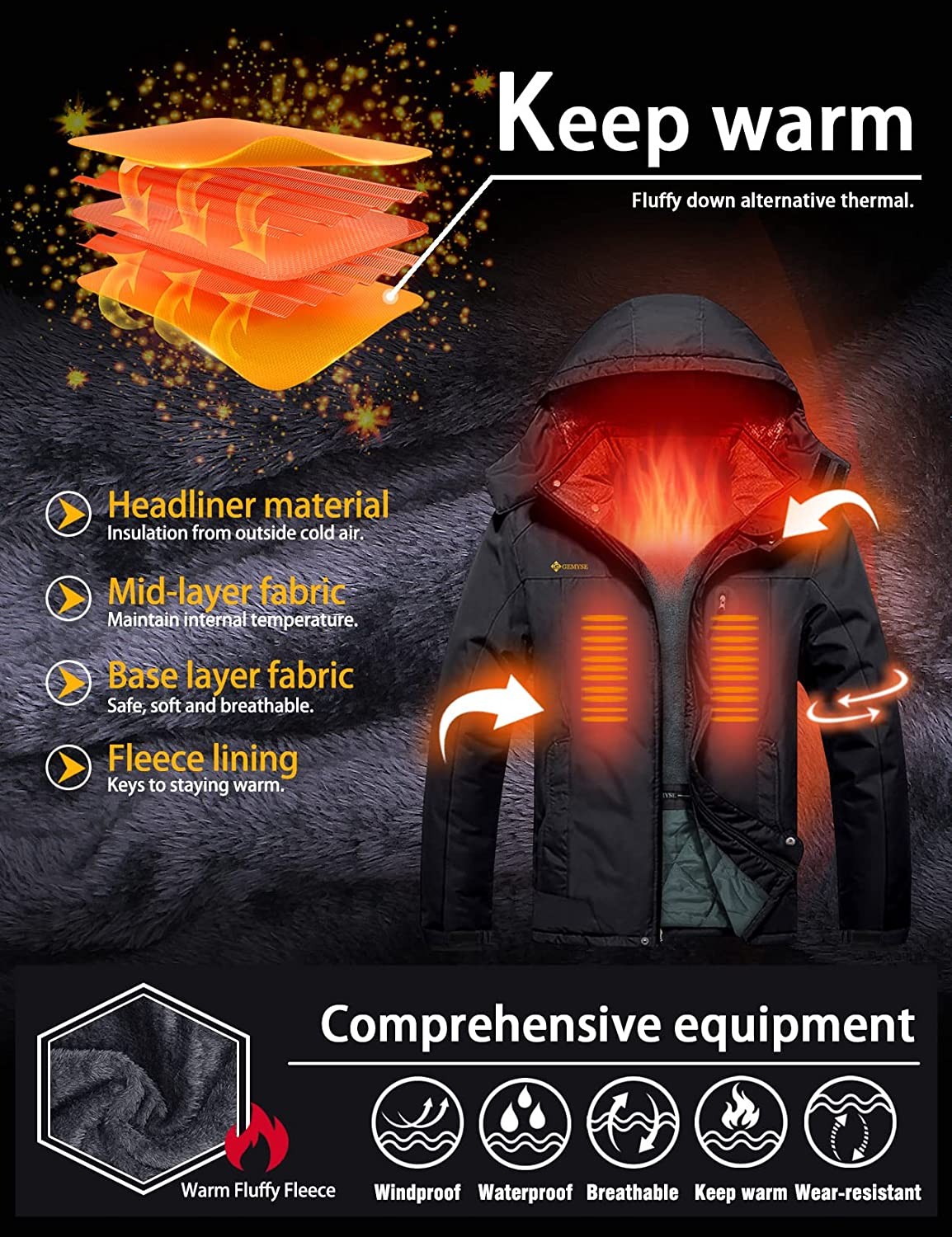Zipper closure Warm & Durable: The outer fabric is durable and wear-resistant, and the inner soft fleece lining is thick enough to keep you warm and comfortable during the cold winter yet breathable to wear. The stitching is reinforced, and solid enough to wear for years. Waterproof & Quick Dry: Professional water repellent coated, the waterproof level is 10000mm/H2O and all the zippers are waterproof design. You won't worry about getting wet while skiing, snowboarding, or on rainy days. Our waterproof rain jacket will provide you with all-around effective protection against stormy or foggy weather, keeping your body dry and warm all day long. Windproof Design: 1. Adjustable velcro cuffs and stretchable glove with thumb hole help seal in warmth; 2. Detachable storm hood, stand collar, and full zipper closure, all the well-designs keep out the wind effectively; 3. Wear a resisting soft shell that is highly windproof and warm. Occasions: Our loose-fitting outdoor travel insulating jacket is ideal for downhill skiing, snowboarding, snow sports, hiking, mountaineering, camping, rock climbing, biking and other winter outdoor activities. Practical Pockets: 2 zippered hand pockets, 1 zippered chest pocket, 1 internal big mesh pocket, and 1 internal secure pocket, suitable for storing phone, wallet, passport, and other accessories. There is an earphone line fastening device inside the jacket.