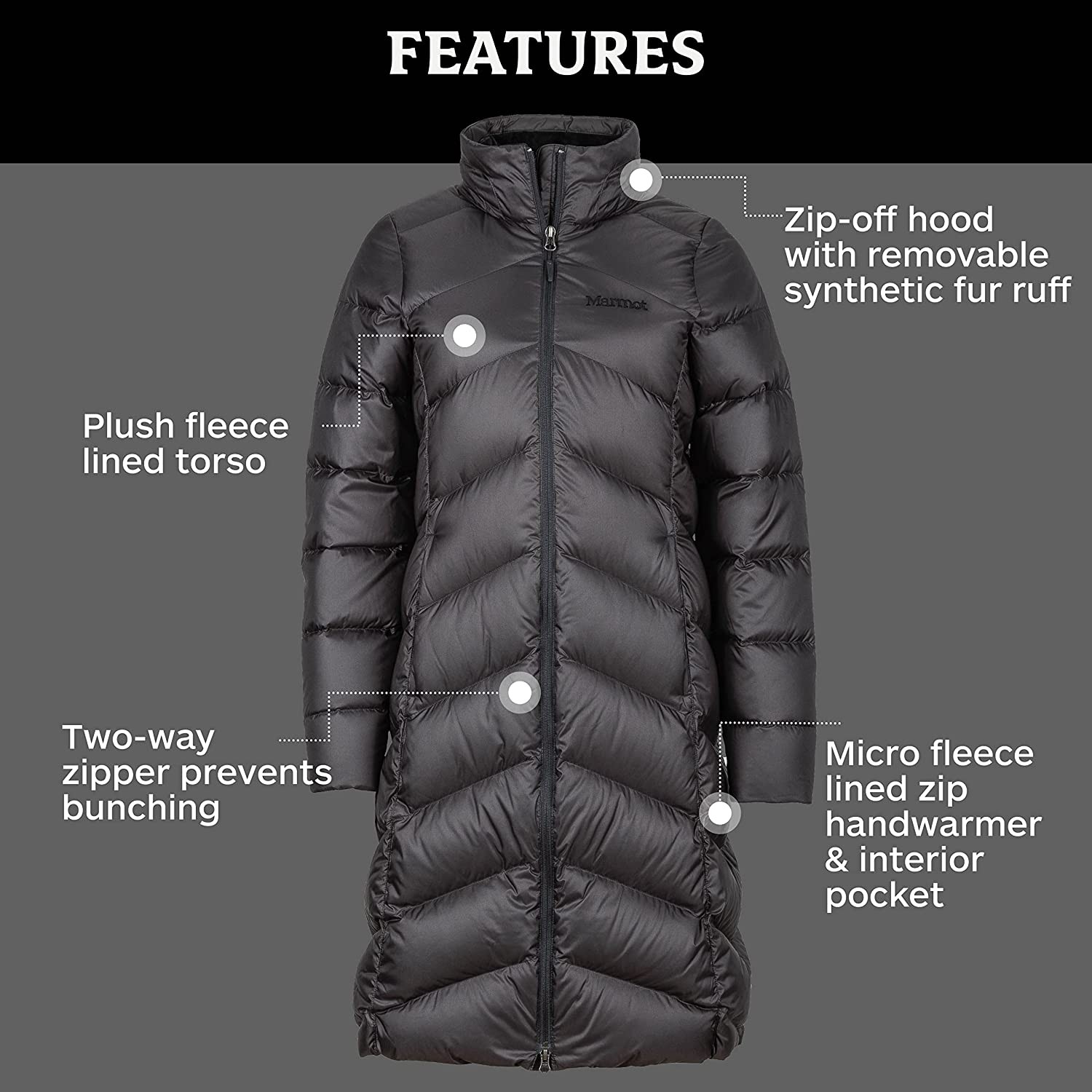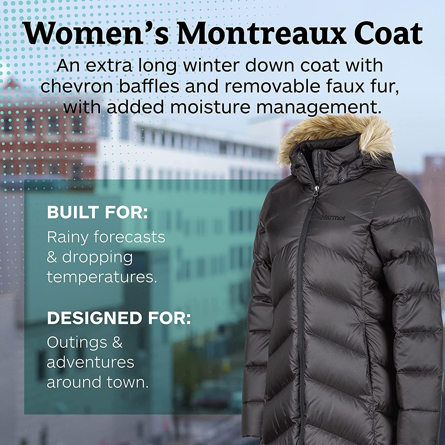 100% Polyester Imported Zipper closure Machine Wash Stay Warm And Effortlessly Chic - With this full-length parka, you don’t have to sacrifice style to be protected from the elements. Tough, water-resistant fabric and high-quality down insulation make it a cold-weather staple for city living, the great outdoors, and everything in between. Full-Coverage Comfort, Modern Design - Made especially to provide full coverage and protection in extreme winters, coats in our Montreaux collection are insulated with 700-fill power down and treated with Down Defender to repel moisture. A plush, fleece-lined torso and micro-fleece cuffs make this coat extra comfortable. Chevon baffles and a zip-off hood with removable faux fur ruff add modern appeal. Fashionable And Functional - Yes, it’s got pockets — four of them, in fact. The Montreaux Full-Length Puffer Coat allows for safe storage of personal items in its micro-fleece-lined zippered handwarmer pockets as well as in its interior zip pocket and drop pocket. Innovating To Improve The Human Experience - Marmot strives to deliver best-in-class warmth, protection and ease of use on every product. To prevent bunching, we’ve added a two-way zipper — and just about every feature you could want in a stylish winter parka. We Have You Covered - With Marmot, we warrant every product we make to be free of manufacturer defects. The best part is you do not need to register your product. Our lifetime warranty covers you from the moment you purchase our apparel or equipment.