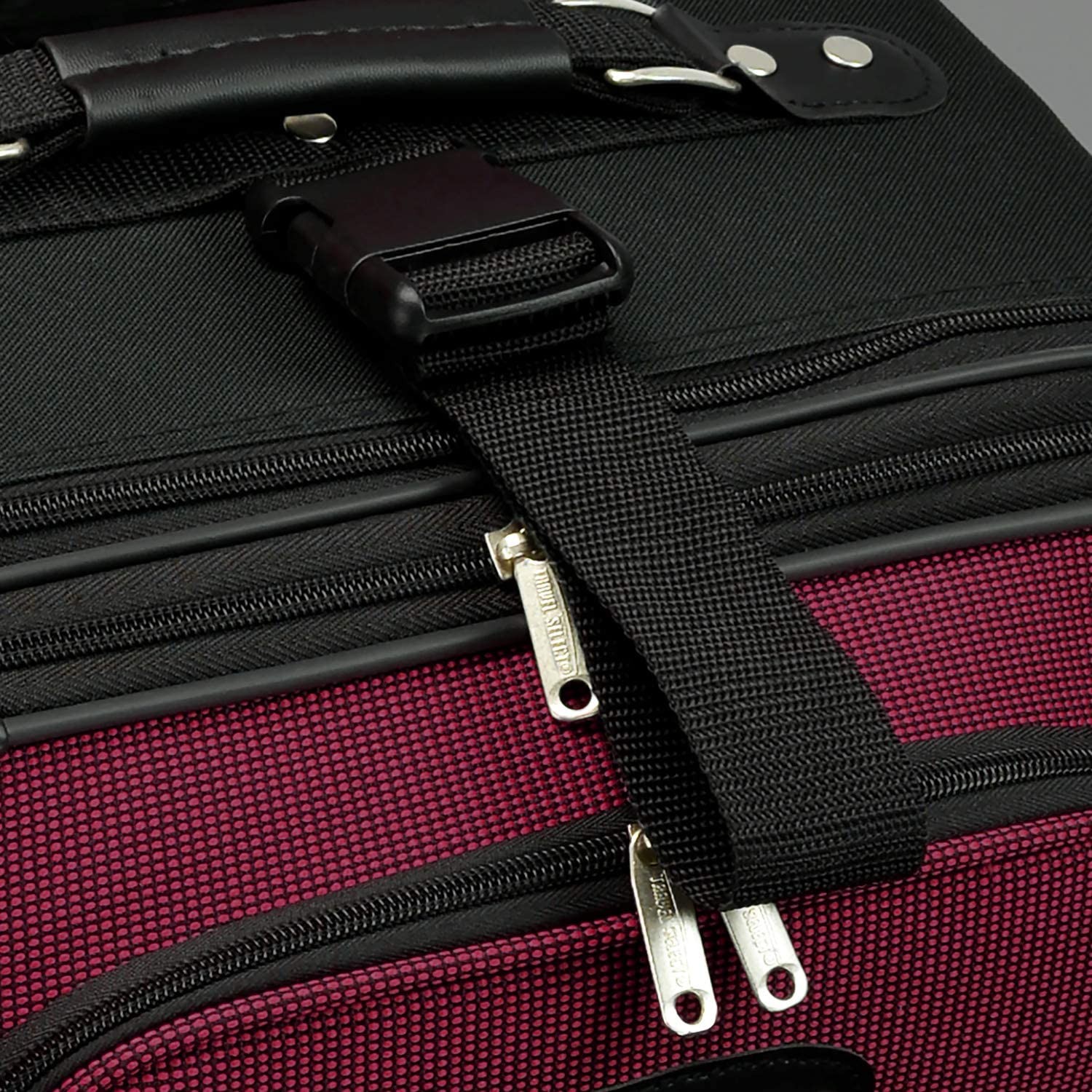 Constructed of 1200D 2-tone polyester with PVC backing (Front Panel) Retractable push-button handle system and full imprinted lining. Top & side carry handles and bottom grip handle Expandability increases packing capacity by 25% Inline skate wheels with corner protectors for smooth quiet rolling Full lined interior and large zipper pockets with compression straps to keep everything in place The dimensions on this carry-on upright are: 21" h x 14" w x 8" d (expands to 10in. d) and is 8 lbs The tote that comes with it is 15"w x 11" h x 6" d and weighs 1.80 lbs Luxurious superior two-tone polyester construction Interior deluxe retractable push-button handle system Smaller piece of luggage will be inside the larger one