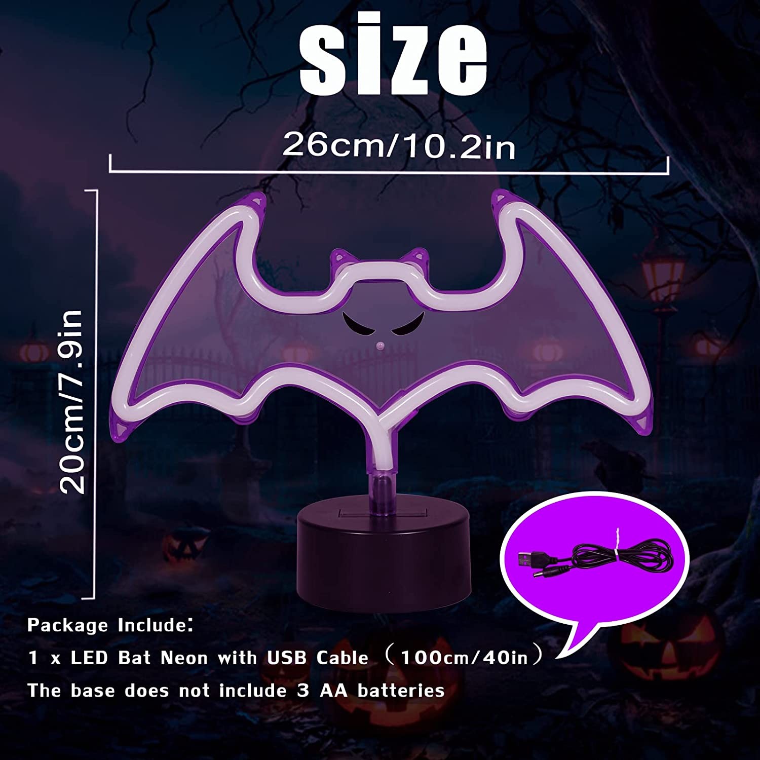 Purple Bat Neon Sign with Base, Halloween Decoration LED Bat Neon Light Signs Indoor Table Decor Neon Lamp USB or Battery Powered Bat Lights with Pattern for Halloween Party,Bar,Room Décor,Kids Gift