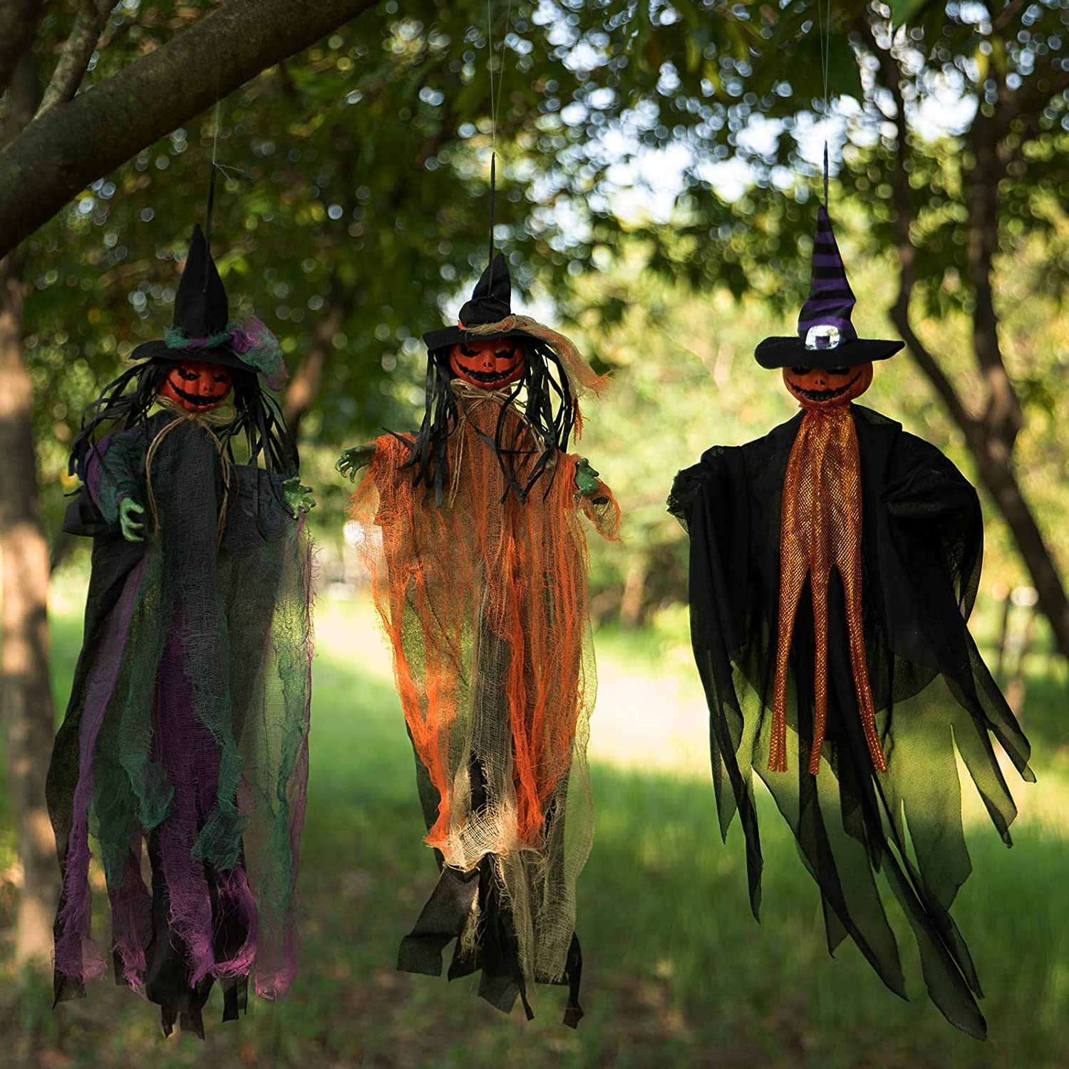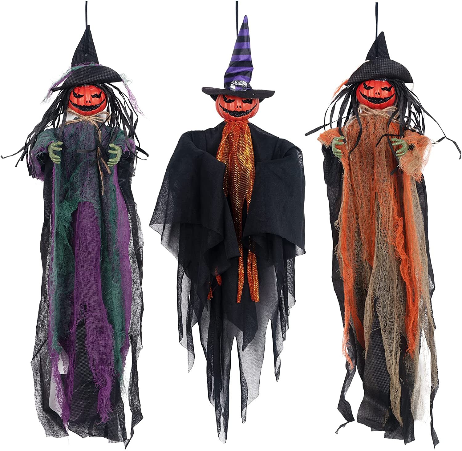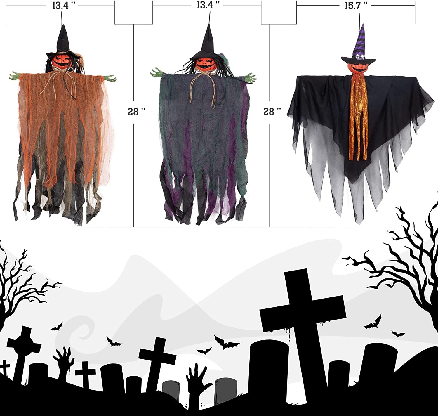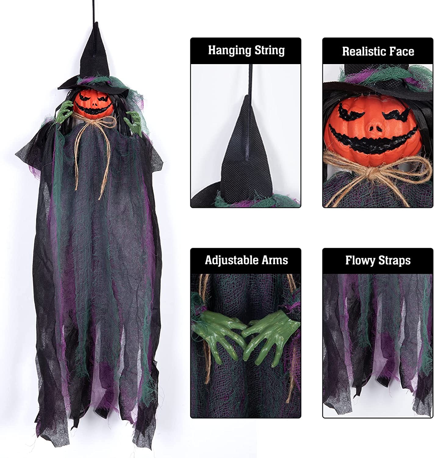 【Pose and Prank】Flexible arms of these Halloween hanging decor enable you to display them as you like! Decent decoration fillers for outside, just hang them up with the attached string 【Scary but Fun】No one could resist the spooky charm of smiling pumpkin and flowing fabric! When a breeze blows,they COME ALIVE.If you forget they're out here,they'll scare the crap out of you 【Durable and Reusable】Held up very well through the rain and wind,these Hallween deracotion outdoor will store nicely and last multiple Halloweens 【Great Buy for Money】These are a cost effective way to really up the spook factor.Different hair and layered outfits for each Halloween grim reaper turn out really amazing 【All Ocasions】Blend perfectly with any Halloween party decorations, these hanging halloween props will work great indoor as well as outdoor, bring you a ton of screaming and laughter from your friends and trick or treaters