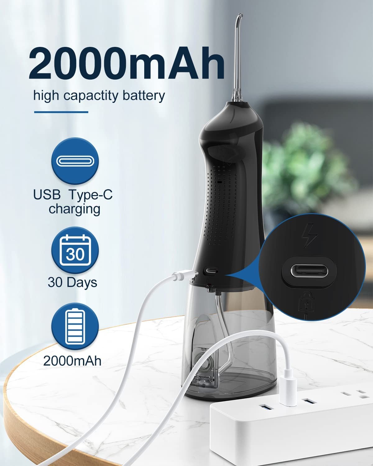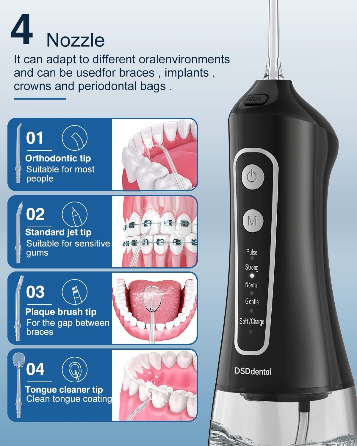 【Deep Clean Teeth and Improve Gum Health】 With the upgraded unique pulsation technique, it offer to provide 1400-1800 times/min high-pressure water pulse, 30-120PSI strong water pressure, can remove 99.99% of deep food residue, massage gum-line to promote blood circulation for healthier gums. 【5 Flossing Modes to Suit All Different Conditions of Teeth and Gums】5 pressure settings ( from gentle to maximum clean) Our cordless water flossers for teeth are perfect for anyone with braces, implants, crowns, or periodontal pocket. Please select “Gently “ mode when you use dental flosser at the first time. 【Long Lasting Battery & USB Type -C charging】Our rechargeable water flosser lasts up to 30 Days (Work Twice Each day). No need to replace the battery frequently. And including 4 interchangeable nozzles, suitable for the whole family. For this water flosser, we have upgraded the t-ypec charging interface and eliminated the micro USB interface, so you don't have to worry about the missing charging cable, because it can be compatible with your mobile phone charging interface. 【320ML Water Tank Capacity &IPX7 Waterproof】The 300ML large-capacity water tank is designed for continuous use of water oral flosser, without the need for multiple water injections. IPX7 waterproof level and with double sealing ring, reliably prevent water leakage, can be used when showering ! 【DSDdental Flosser Warranty & Support 】We provide a 1-year full warranty on the flosser. For any kind of issue you may contact our support line.