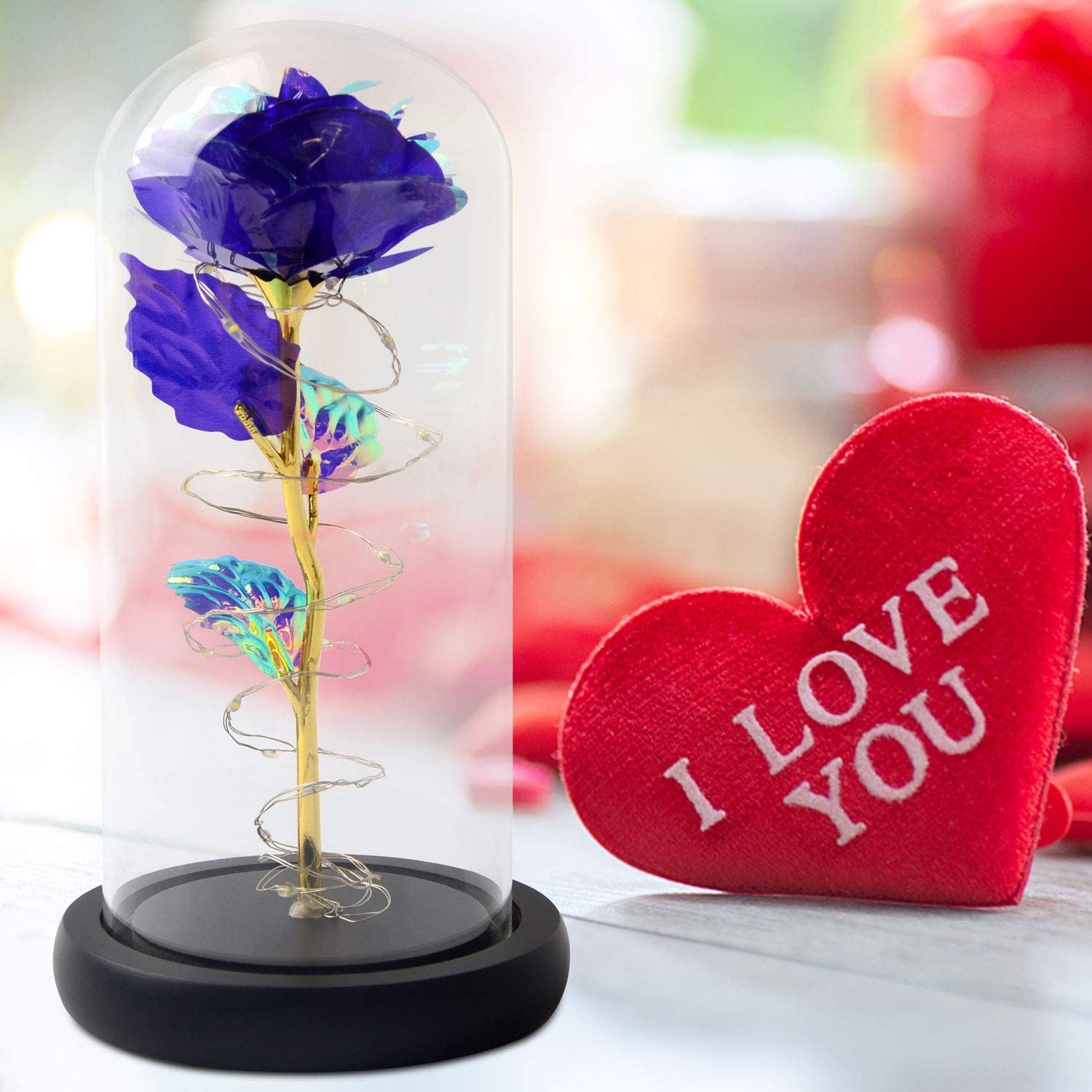 ?rose: Never Withered Roses have always been a symbol of beauty and love . This purple rose flower will never wither and die. The Eternal Rose Flower is perfect and impeccable. It is as full of infinite beauty and hope as a rainbow.And it will bring you infinite love and sweet. ?Charming & Romantics: Red rose, Charming and romantics! Not only as a symbol of appreciation, also is a symbol of best wishes. The Red Rose glass dome represents Faith in Love . It is a special way to telling her/him "Love you more as time goes by". ?Beautiful home decor: The tiny LED lights are embedded in the petals,from the rose to the petals falling on the base ,the warm white light illuminates the entire dome.LED string is made with a fine bendable copper wire that create any shape you want.Safety and light circle dome cover allows LED light to shine more briliantly than glass cover,resists yellowing & discoloration,and is easier to clean! ?Perfect gift: This is a well-made, full of meaning gift, it can be stored for a long time like new, Ideal Gift for Valentine's Day,Mothers Day,Anniversary,Wedding,Engagement,Birthday. The gentle rose is not only the best gift for girlfriend, wife's wedding anniversary, child's birthday,mother's birthday, or Mother's Day, Father's Day,Thanksgiving Day,Valentine's Day and Christmas,But also the high-quality led family home gift for anniversarie