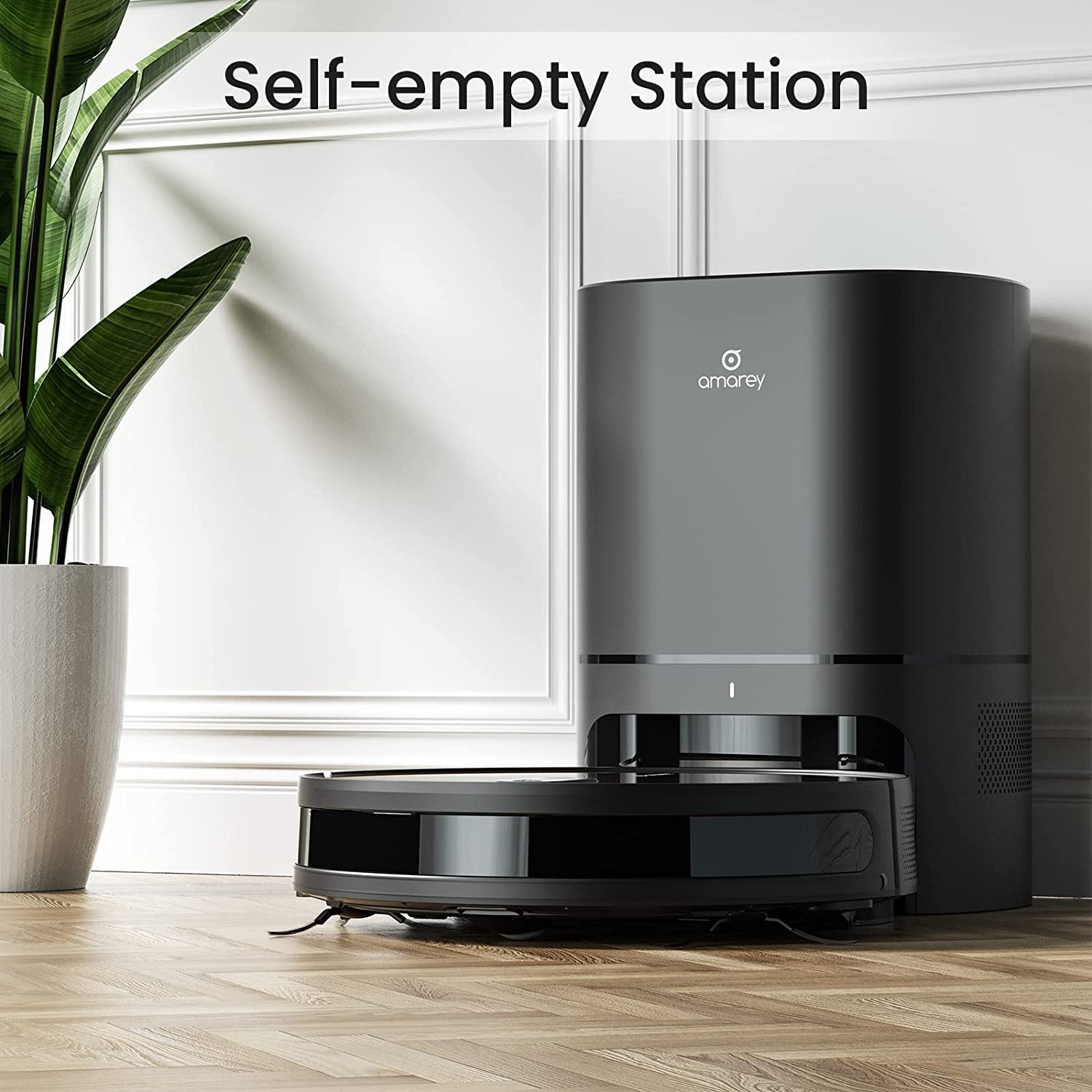 45 Days Hands-free Cleaning: The robot vacuum is equipped with a 2 in 1 auto-empty dock and charging base, emptying itself into a large 3L dust bag that has the capacity to collect weeks of dirt. It helps you dispose of dust, pet hair, and other debris in your home without lifting a finger. Vacuum and Mop in One Time: Amarey combo robot vacuum and mop adopts a 300mL water tank, which can clean up to 500 square feet. Additionally, you control the rate of water flow through the app to reach a balance of moistness and quick-drying, and the damp pad cleans your vacuumed hard floors. Smart Mapping: Amarey A90+ vacuum robot features visual navigation to map your room and plan an efficient cleaning route. It allows to clean the targeted area and set up a No-go zone. Moreover, you can choose to schedule cleanings when you are not at home. 3000Pa Strong Suction with Low Noisy: The Amarey robotic vacuum cleaner uses a brushless motor to greatly reduce the vacuum noise under 58 dB. A great option for vacuuming your pet hair in the carpet with its 3000Pa powerful suction. Plus, two side brushes can largely collect debris along the wall. Automatic Recharge and Long Runtime: Amarey robot and mops for floor cleaning will return to the base to recharge itself if it runs low on battery. The battery holds a charge for 110 minutes of run time which is long enough for most sizes of room. But the runtime differs from the cleaning mode you choose. What you can get: 1x Amarey robot mop and vacuum, 1x Self-emptying base, 1x Rolling brush, 4x Side brush, 1x Efficient filter, 1x 2-1 Dust and water tank, 2x Dust bag, 1x Mopping module, 1x User guide and 24 Months worry-free warranty.