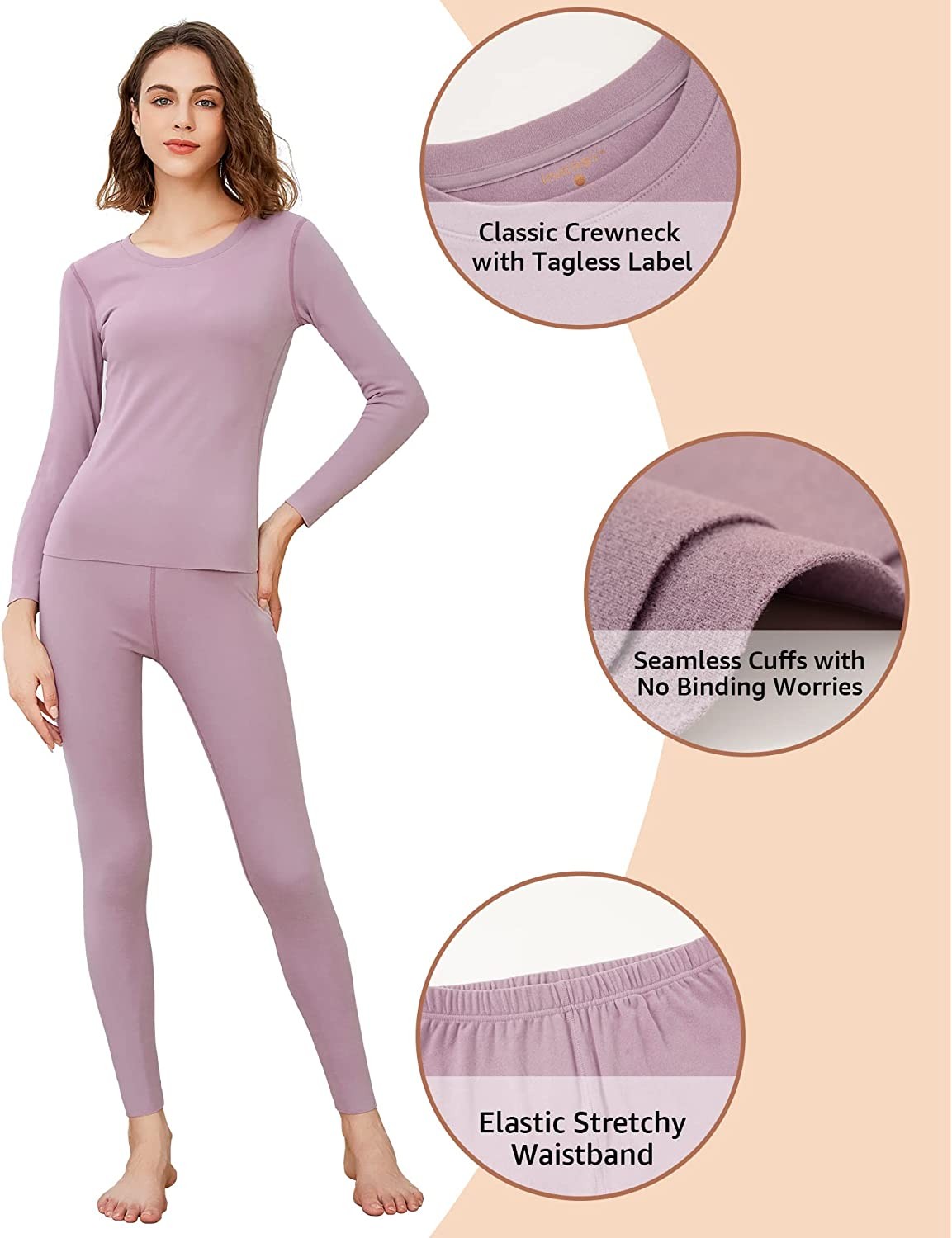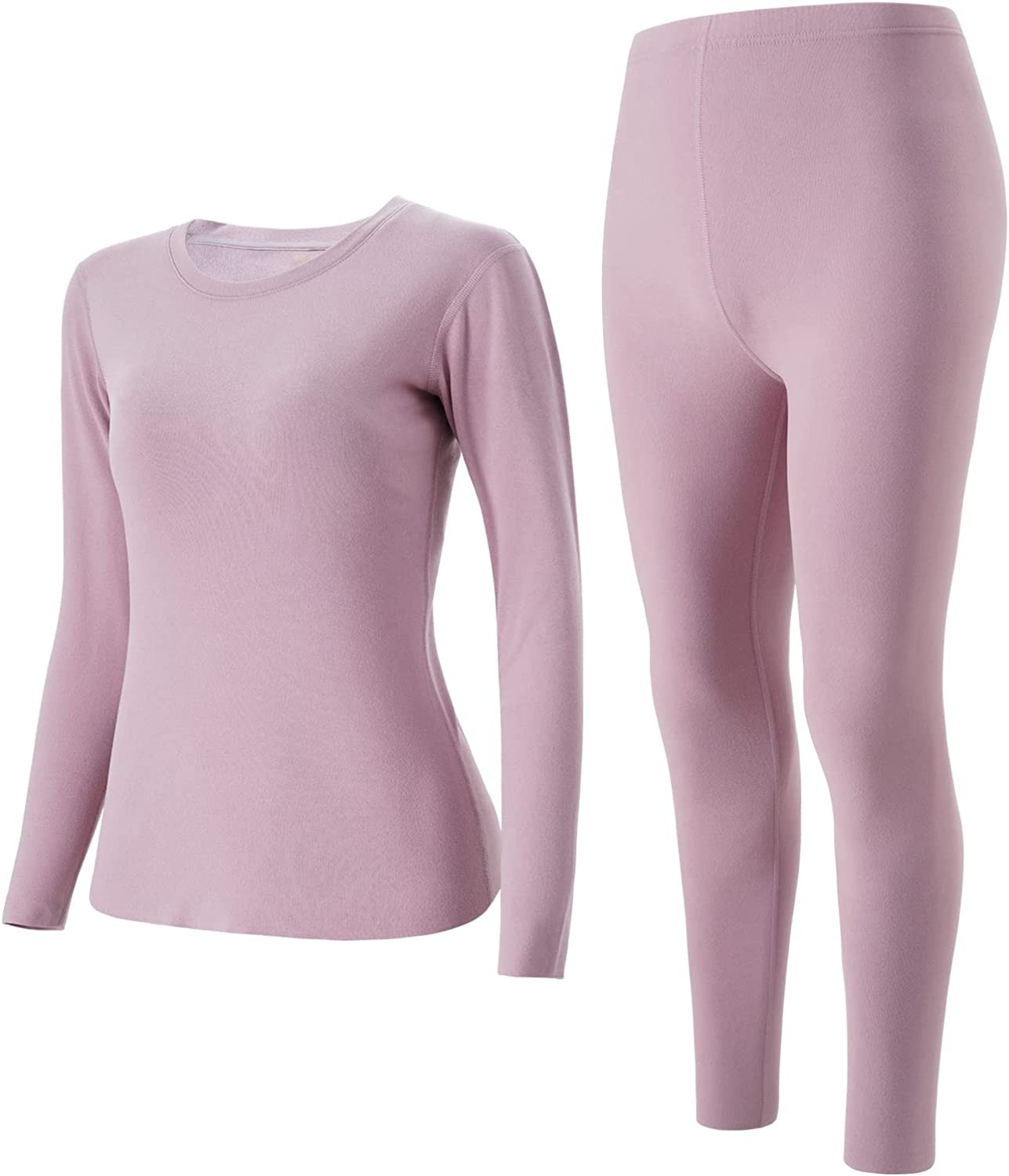 90% Polyester, 10% Spandex Imported Pull On closure Machine Wash Thermals Top & Bottom Set: This ultra thin pair of thermals features classic crewneck with tagless label, seamless cuffs with no binding worries and elastic stretchy waistband Thin & Light Base Layer: This long johns set is thin enough to easily wear underneath regular clothes. The inside of the set is treated with sanding to retain heat and keep you warm in cold weather. No more freezing worries on cold days. This long underwear is also lightweight enough to be easily packed up into a suitcase for trips Free Movement: This close-fitting women’s long underwear with stretch is a perfect insulating layer for chilly days that you can put on for outdoor activities such as skiing, hunting, camping or snowboarding. The surface of this polyester-spandex fabric is treating with sanding to add a smoother feel and allow easy slip-on and put-off, which also allows flexible movement A Perfect Under Layer in Winter: The inside of the garments are soft and the outside is smooth, which allows outwear to slide over this thermal underwear with no catching or bunching. The material is also thin enough that it doesn’t create a bulky feel Ideal Sleep-in Thermal Pajamas Set: Soft and comfortable to sleep in. Little shrinking after washing