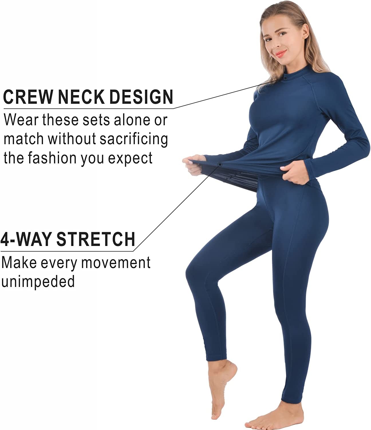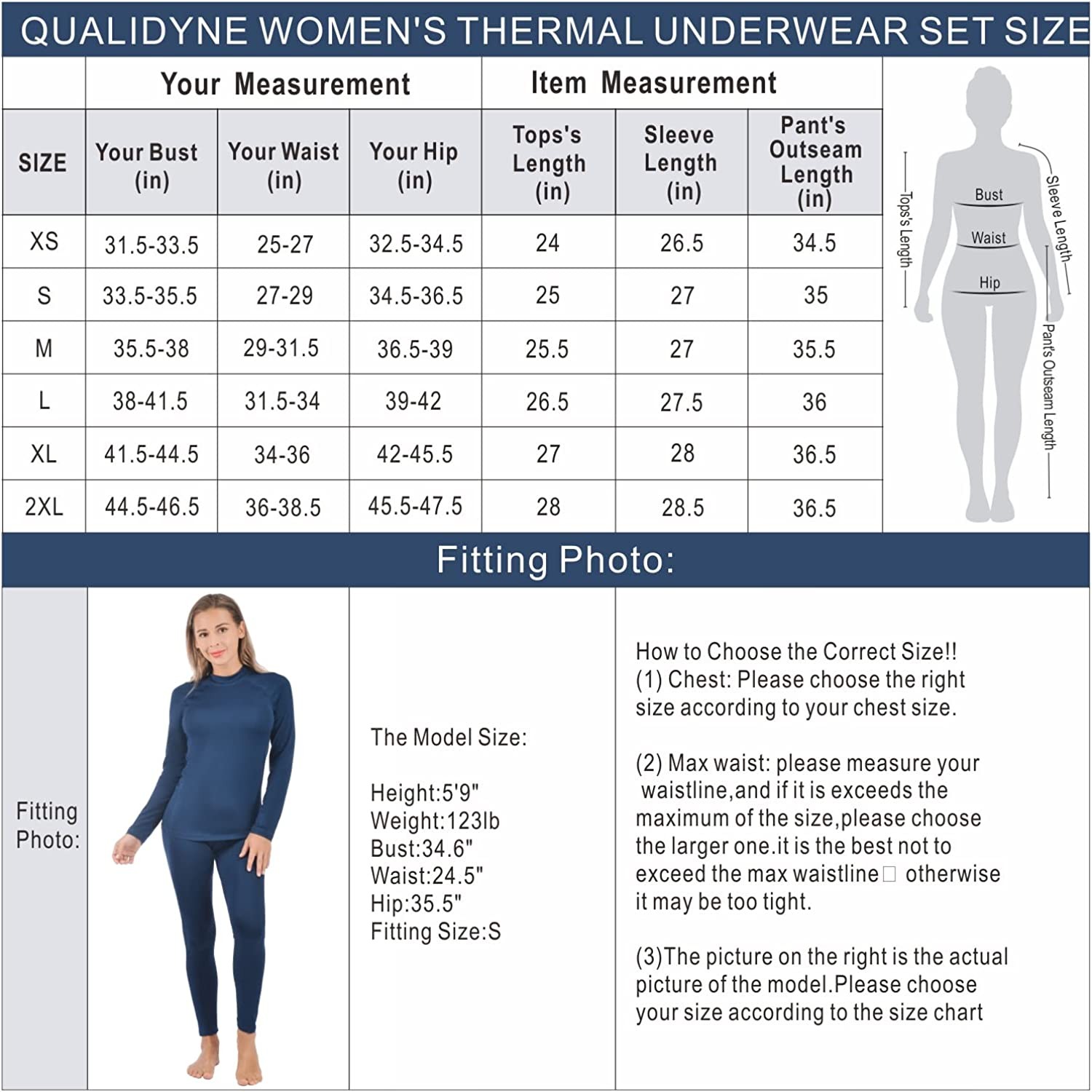 【Limited Promotion】Save 10% on Mens Thermal Underwear (B08FD68XFH) when you purchase 1 or more Womens Thermal Underwear. Enter code 6ADJNUV4. Pull On closure 【Ultra Soft Fabric】Women's thermal underwear set is made of 90% polyester 10% spandex premium moisture wicking and breathable fabric, which will absorb sweat and dry quickly in exercise and keep you with no clammy feeling for comfort. Premoum fabric is without pilling & fading. 【Keep Warm & Breathablity】These long johns set high-neck design fits the skin better and warmer than other round-neck designs; Perfect for cold weather, comfy stretch softwear in normal thickness, breathable, lightweight but warm, works during your Winter activities like skiing for added warmth. 【Flexibility For Any Movement】Qualidyne womens winter thermal top & bottom are designed with four way stretch fabric that allows you to keep your body looking slimmer and to enjoy a great freedom of movement while at the gym, office or home. Greater flexibility to cover more people. Flatlock stitching creates a flat seam to the garment to ensure maximum comfort. 【Comfortable & Durable】Womens winter thermal clothing against the skin, its strong seams won’t rip or tear prematurely, offering long life. They fit snug like a second skin for perfect heat retention minimizing heat loss for an ideal base layer. Draping tailoring provides super comfort and body fit. They won’t bunch up and contour to the shape of your body. 【For Any Occasion】The women's long shirts and pants are perfect for cold weather, idea for all kinds of outdoor activities, such as skiing, hunting, camping , snowboarding, cycling, motorcycles, running, climbing, traveling etc, Also good to wear at home or as a base layer under your coats, it also will warm you as comfy pajamas on cold nights.