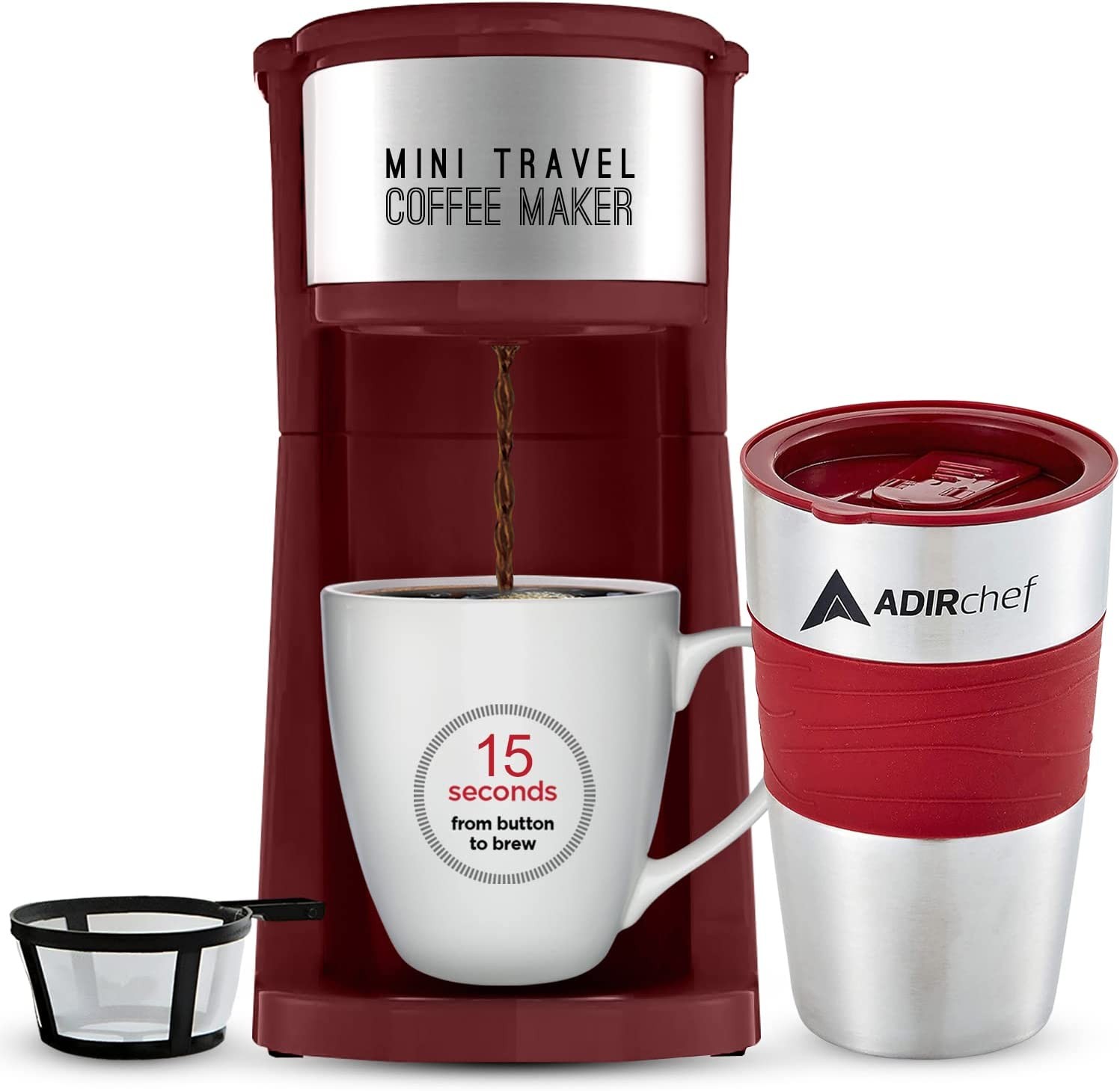 AdirChef Single Serve Mini Travel Coffee Maker & 15 oz. Travel Mug Coffee Tumbler & Reusable Filter for Home, Office, Camping, Portable Small and Compact for Fathers Day (Ruby Red)