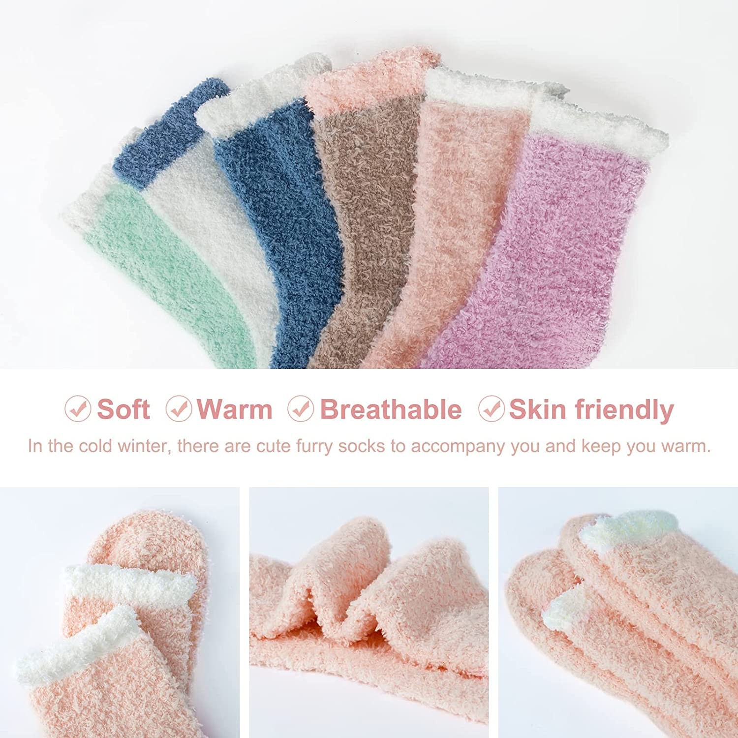 Comfy & Soft: Womens fuzzy socks are made of soft coral wool. Fuzzy socks for women are super soft, warm, durable and breathable. Women fluffy socks can keep your feet warm and comfortable even in the coldest winter. Comfortable soft socks are the ideal choice for sleeping socks or slipper socks for you to walk freely at home. You can also wear aloe socks outdoors in cold winter.