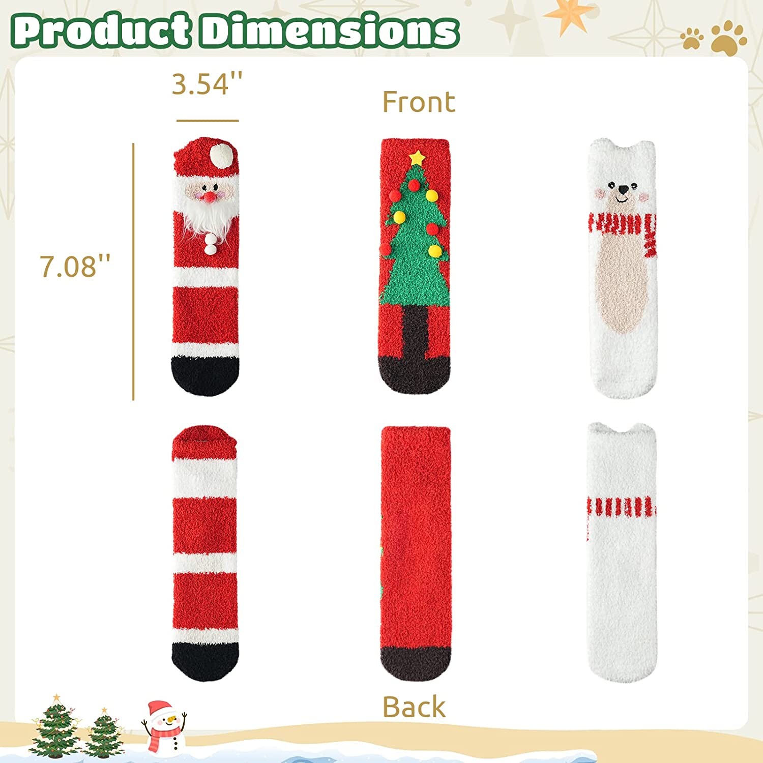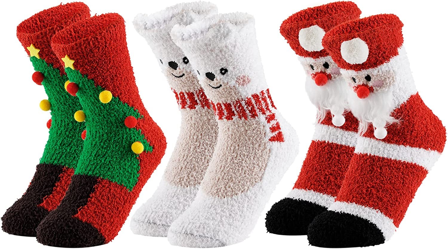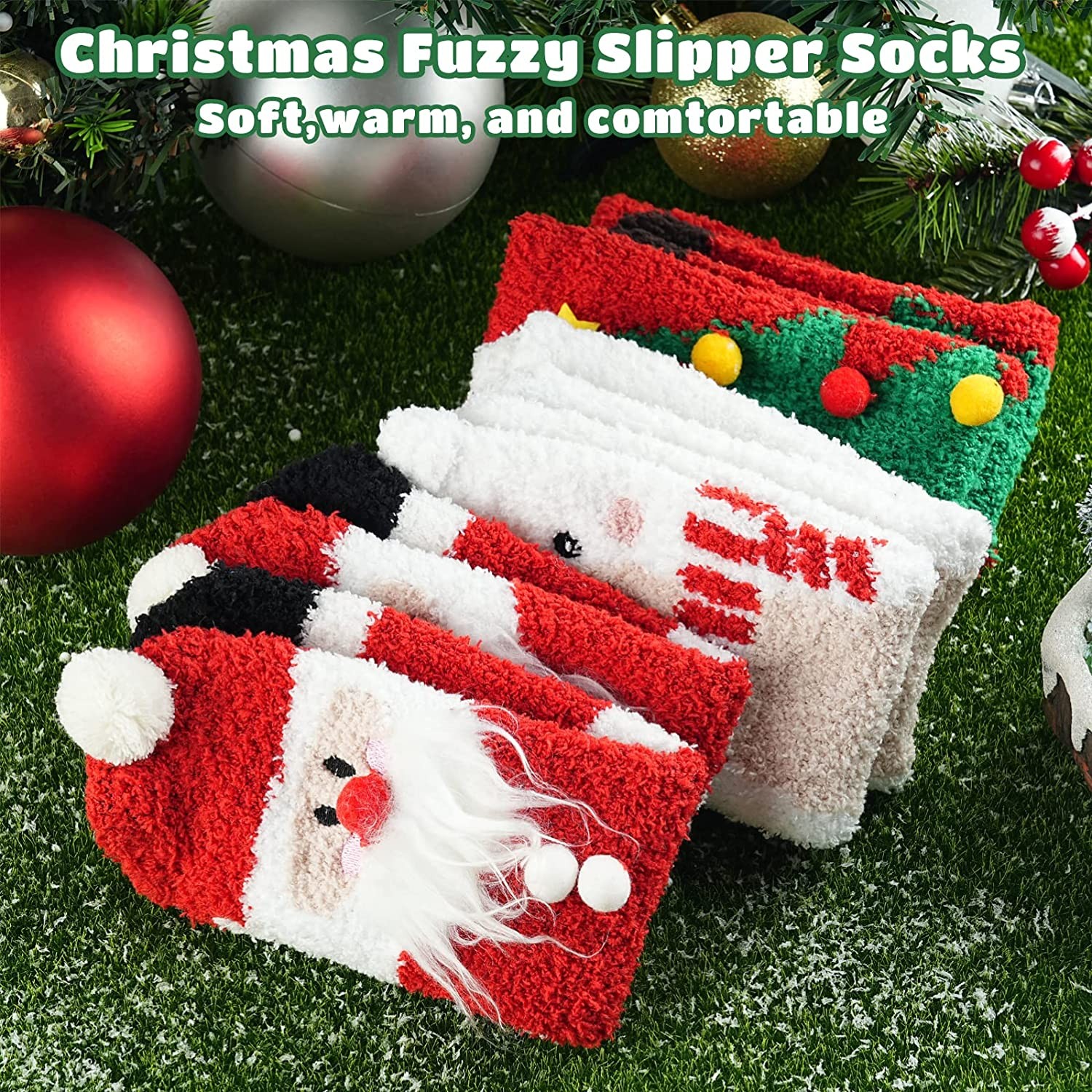 1. Keep Your Feet Warm: These warm fuzzy socks will give you cozy, comfortable wear experiences and not compress your legs for everyday activities or sleep. The high elastic and soft fabric will keep your feet comfortable and warm all day in winter. 2. Cute Christmas Style: There are cute 3D Christmas patterns like Santa Claus, Christmas tree and snowman on the sock. These thick Christmas slipper socks will accompany you through the cold winter and bring you a wonderful Christmas! 3. Soft and Comfortable Material: Fuzzy socks are made from a thick blend of polyester and cotton and are knit specially to provide unparalleled comfort and softness. Looking how cute these socks are. And wearing them, what a warm touching you will feel. 4.One Size Fits All: These crew socks come in a standard US SIZE that fits shoe sizes from US 5-10. With exquisite heel and sole stitching, our socks give you enough support and wrapping, helping improve your stability during walking. Easy to put on and take off, suitable for daily wear. 5. Nice Christmas Gift: These cute Christmas holiday socks are suitable for Christmas or daily wear. They can be a good and sweet gift for friends and families. If you have any questions, please be sure to let us know, thank you!