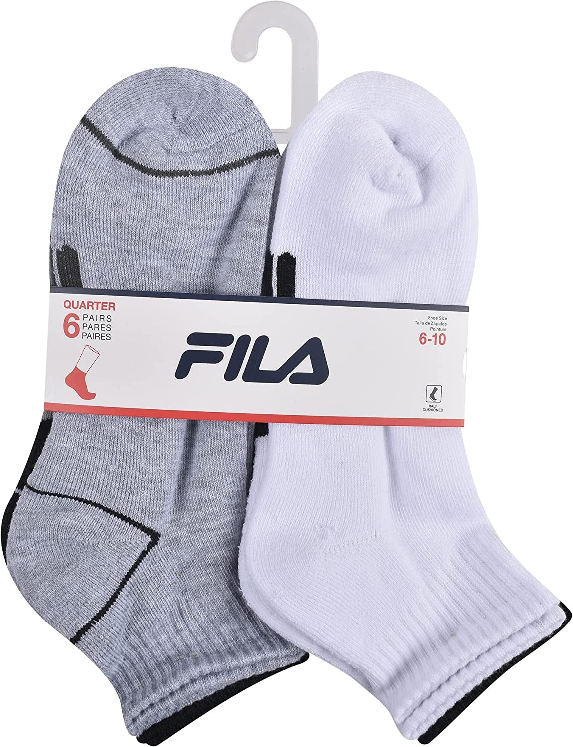 Officially licensed apparel by Fila - Pack of 6 pairs Made of 97% Polyester/3% Spandex blend fabric - Machine wash inside out Knitted in logos graphics - Features 3x1 rib welt for added comfort and snug fit Pull on closure with aerated mesh panels Sizing: One size fits women's shoe sizes 6-10 and men's shoe sizes 5-7 (US sizing)