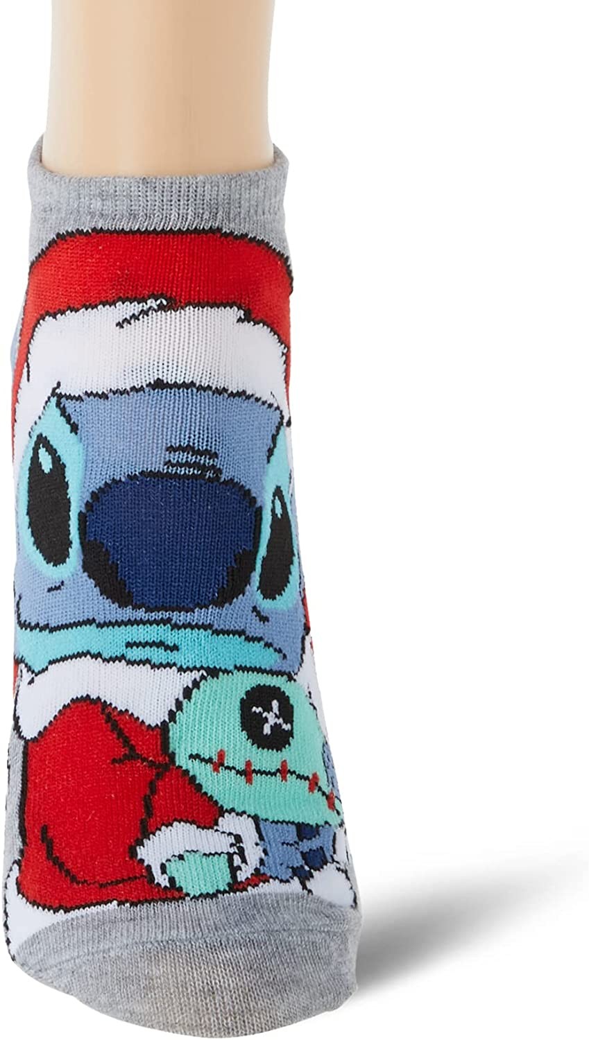 DISNEY SOCKS FOR WOMEN: These classic Disney character socks are officially licensed Disney merchandise featuring adorable, detailed graphics of your favorite Disney characters. Our cute socks for women fit sock sizes 9–11 and shoe sizes 4–10.5. Disney Lilo & Stitch Christmas Themed Socks. CHARACTER SOCKS: Rock your favorite character socks for a comfortable stylish look that will complete any outfit. With 5 Lilo & Stitch themed pairs in a pack, you'll have lots of options to love. COMFORTABLE MATERIAL: These socks are made from high-quality breathable fabric that is 98% polyester and 2% spandex. These durable, fun socks are very comfortable and stretch over the foot as they are pulled on. They stay in place nicely and have a no-show cut. EASY TO CARE FOR: These character socks are machine washable and easy to care for. Turn them inside out before washing to preserve the graphic design, and wash in cold water. Tumble dry, and you will be ready to wear these fun socks again in no time! THE PERFECT GIFT: These classic Lilo & Stitch socks make the perfect gift for any adult. They feature fun, detailed graphics and are well constructed. Our novelty socks are great for any occasion!