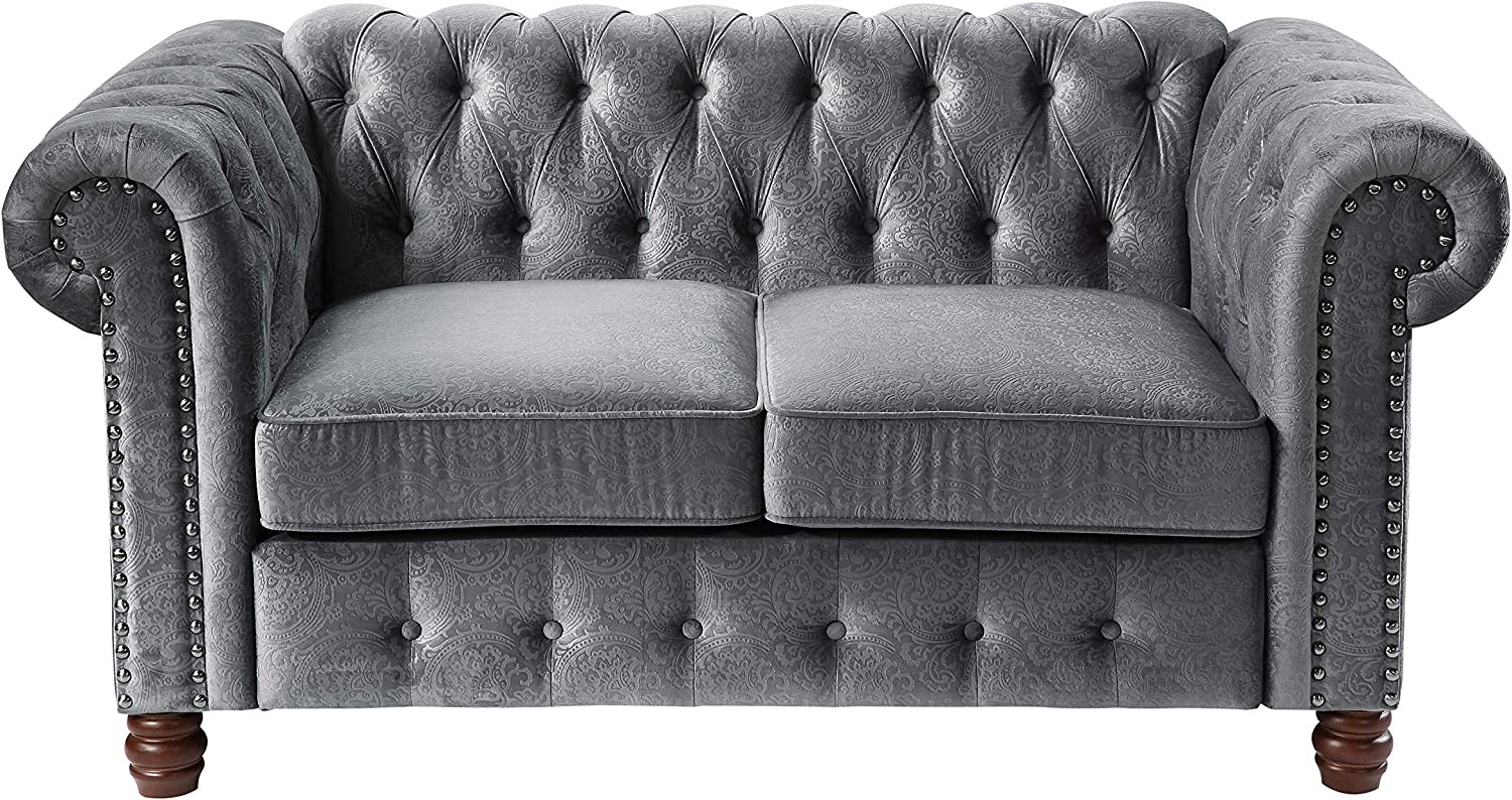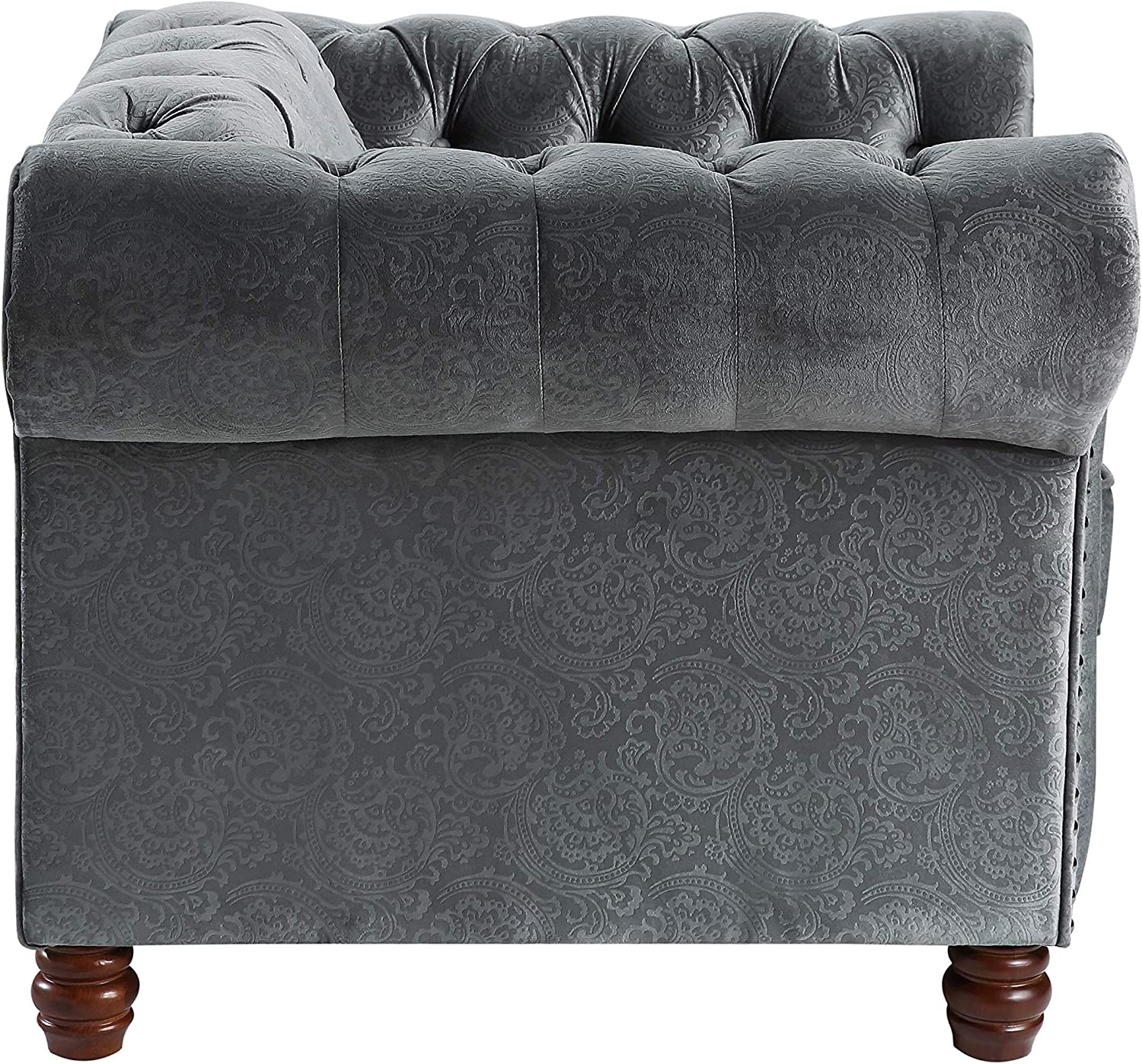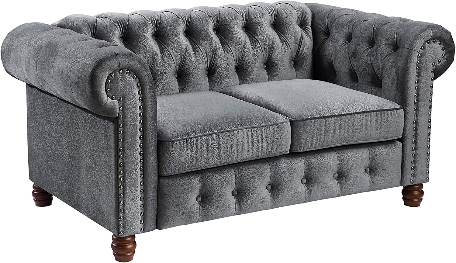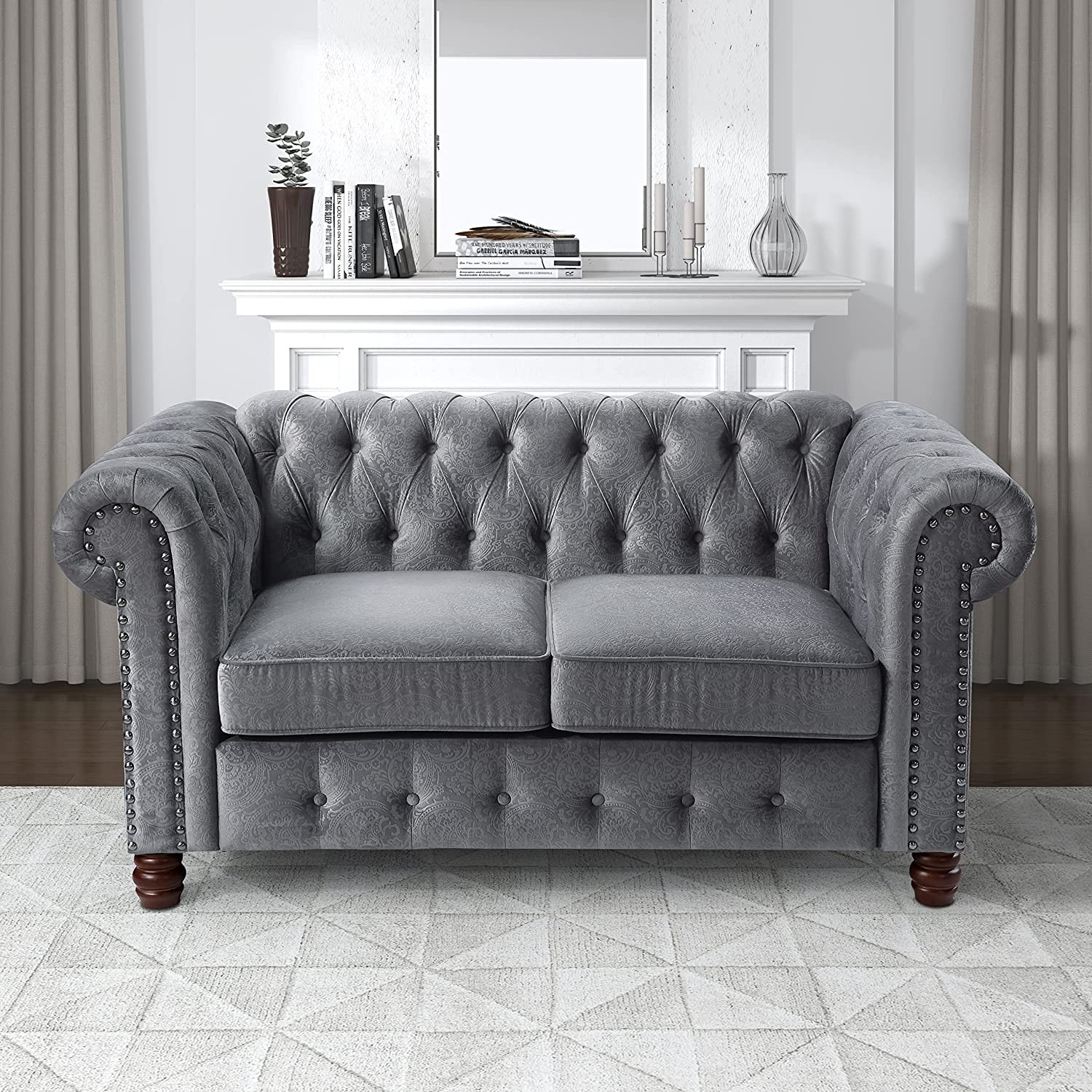 Is Assembly Required: True One (1) traditional chesterfield loveseat measures 63.5" x 35.5" x 31.5"H Dark Gray Velvet Fabric Upholstery + Rolled Arm + Button Tufting + + Nailhead Trim Pine Wood and Plywood Frame + Cherry finished Rubberwood Bun Feet Each Seat Width: 21"; Seat Depth: 24"; Seat Height: 19"; Leg Height: 4" Supports 300lbs/seat; ships in (1) box; requires assembly and 28" doorway width Item weight: 108.0 pounds Care instructions: Clean with dry cleaning solvent only