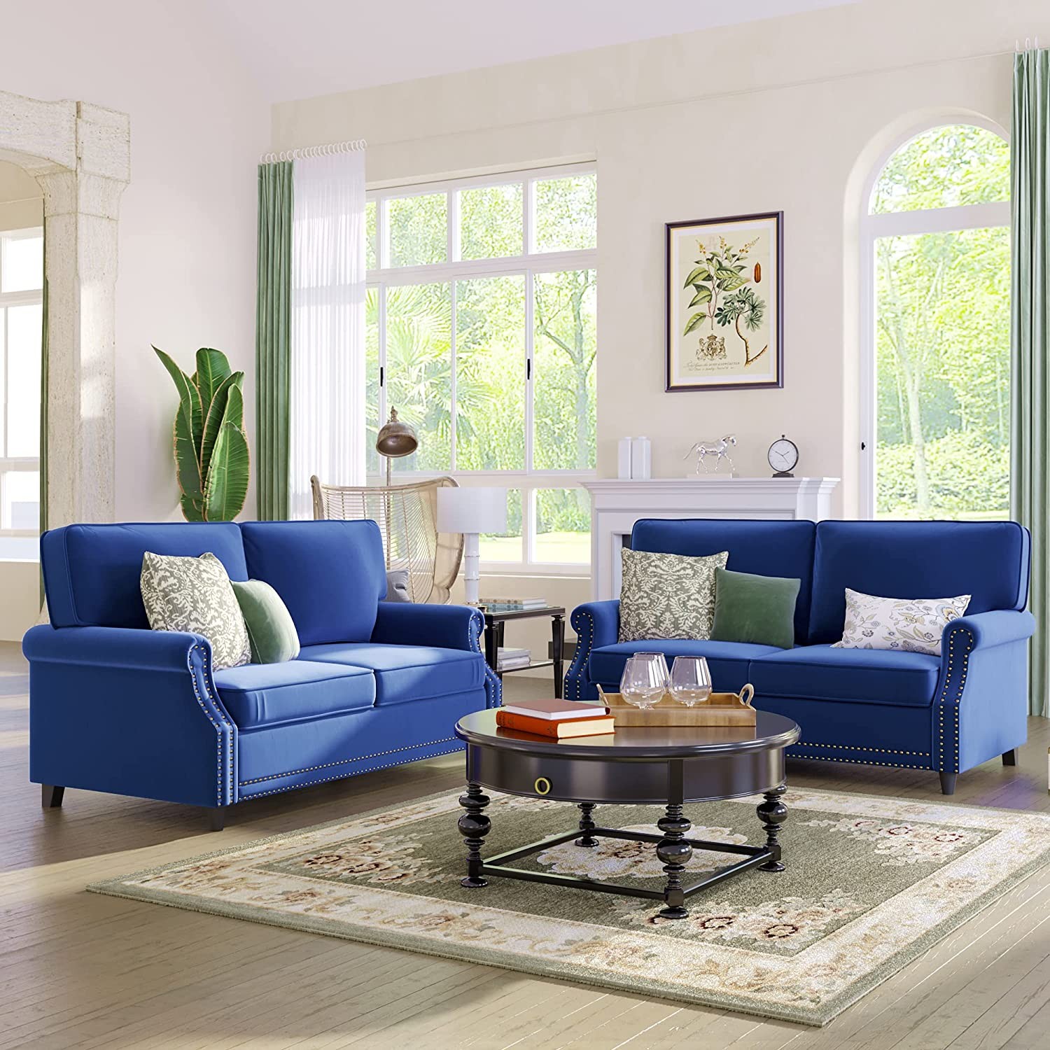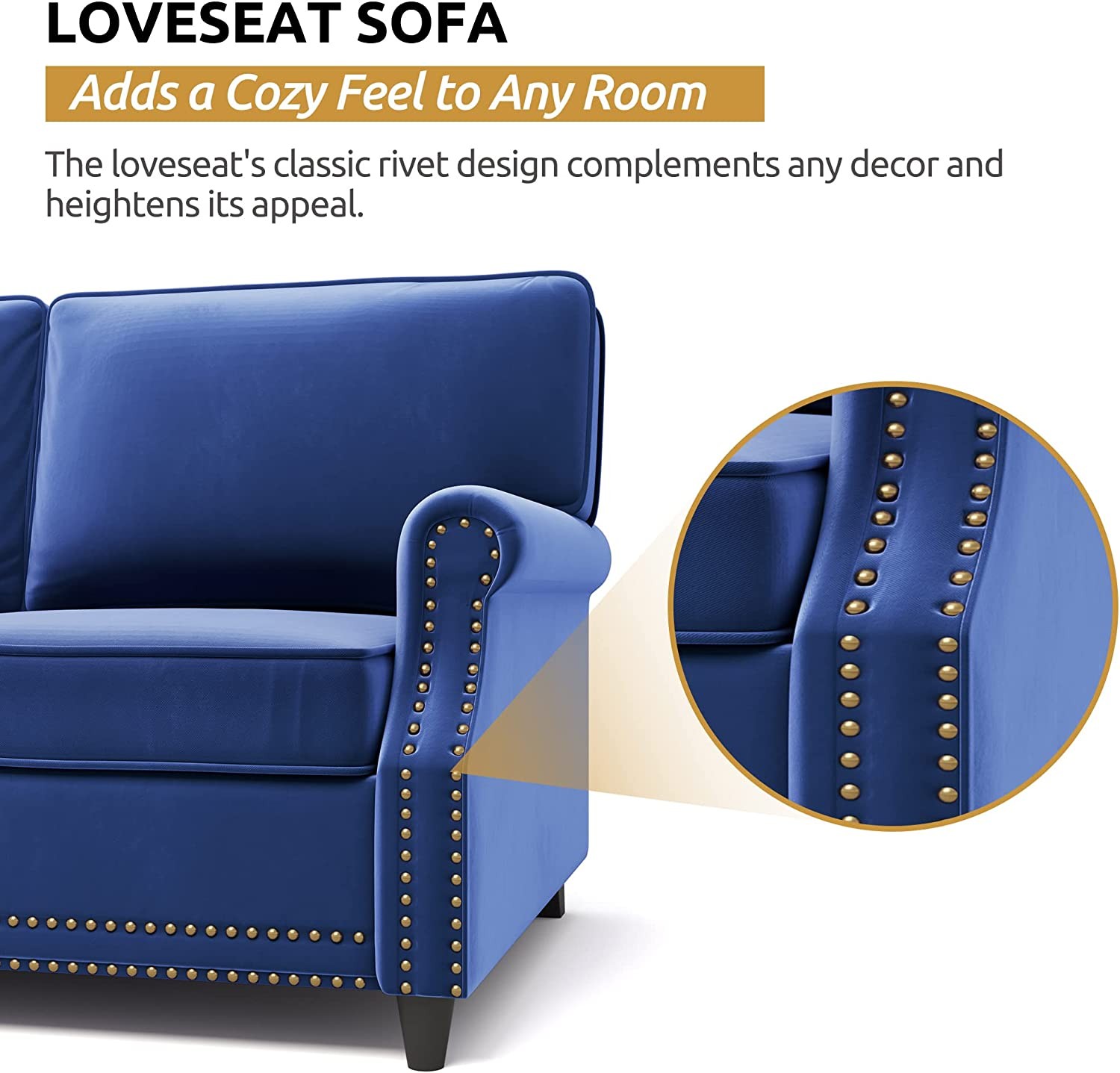 Superb Material: Fabric, (100% polyester) brings a Touch of distinctive soft feeling. Overall Dimensions: 64.5*33.5*36"(L*D*H); Seating Capacity: 2; Weight Capacity: 250 lbs/Seat; Assembly Required. Considerate Design: Use the premium velvet material to chase for the better skin touch while the high-density sponge filler make you feel relieved. The supportive seat cushions and backrest balance softness and durability, so you can easily feel ease and relax. Nailhead Accents: Expertly styled, this sofa has tasteful nailhead accents on the front end of the scrolled arms to draw the eye in and complement the deep button tufting. Each nailhead is individually applied for a beautiful, hand-crafted touch. Individual Seat coushions: With individual seat cushions, plumped with your comfort in mind, this loveseat is as comfortable as it is stylish, if not more so. The individual cushions ensure that each person seated on the loveseat gets the full amount of comfort possible. Easy to Assemnle:A detailed instruction manual can be obtained by opening the package.A complete installation kit, easy-to-follow instruction manual and numbered parts help you quickly and easily partially assemble our sofa in 20`30 minutes.