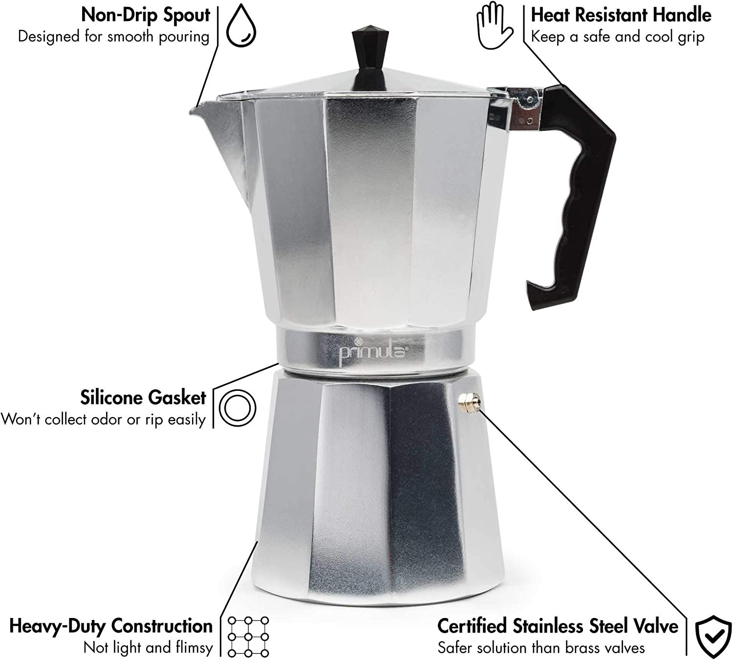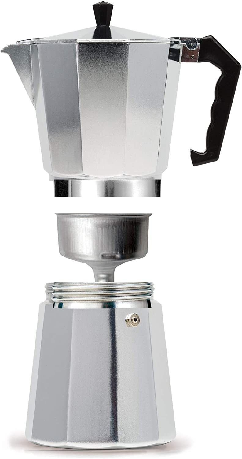 BETTER BREWING - Produces twelve demitasse or espresso servings of rich, smooth espresso coffee within minutes from the convenience of home. DURABLE AND INNOVATIVE DESIGN - Carefully crafted with strong cast aluminum for long-lasting durability. Provides thorough and even heat distribution for enhanced flavor and aroma. SAFETY FIRST - The flip-top lid features a temperature resistant knob and handle that allows for easy, safe pouring. The safety-release valve controls water pressure and delivery for perfectly extracted espresso, every time. EASY TO USE - Simply fill the lower chamber with water, add ground coffee or espresso to the filter, and place on stovetop. Within minutes, delicious, bubbling cups of espresso will fill your pot. Remove from heat and enjoy. EASY TO CLEAN - Simply rinse parts with warm water and allow to dry before reassembling. COMPATIBLE WITH ALL STOVETOPS - Works on all electric, ceramic and gas stovetops, including propane, making it the perfect camping accessory. CRAFT COFFEE, AT HOME - Make coffee house quality coffee from the convenience of your home, brewed exactly to your preferences. Use it to make demitasse espresso, lattes, cappuccinos, Cuban coffee, Italian-style coffee, moka, mochas, crema, etc.
