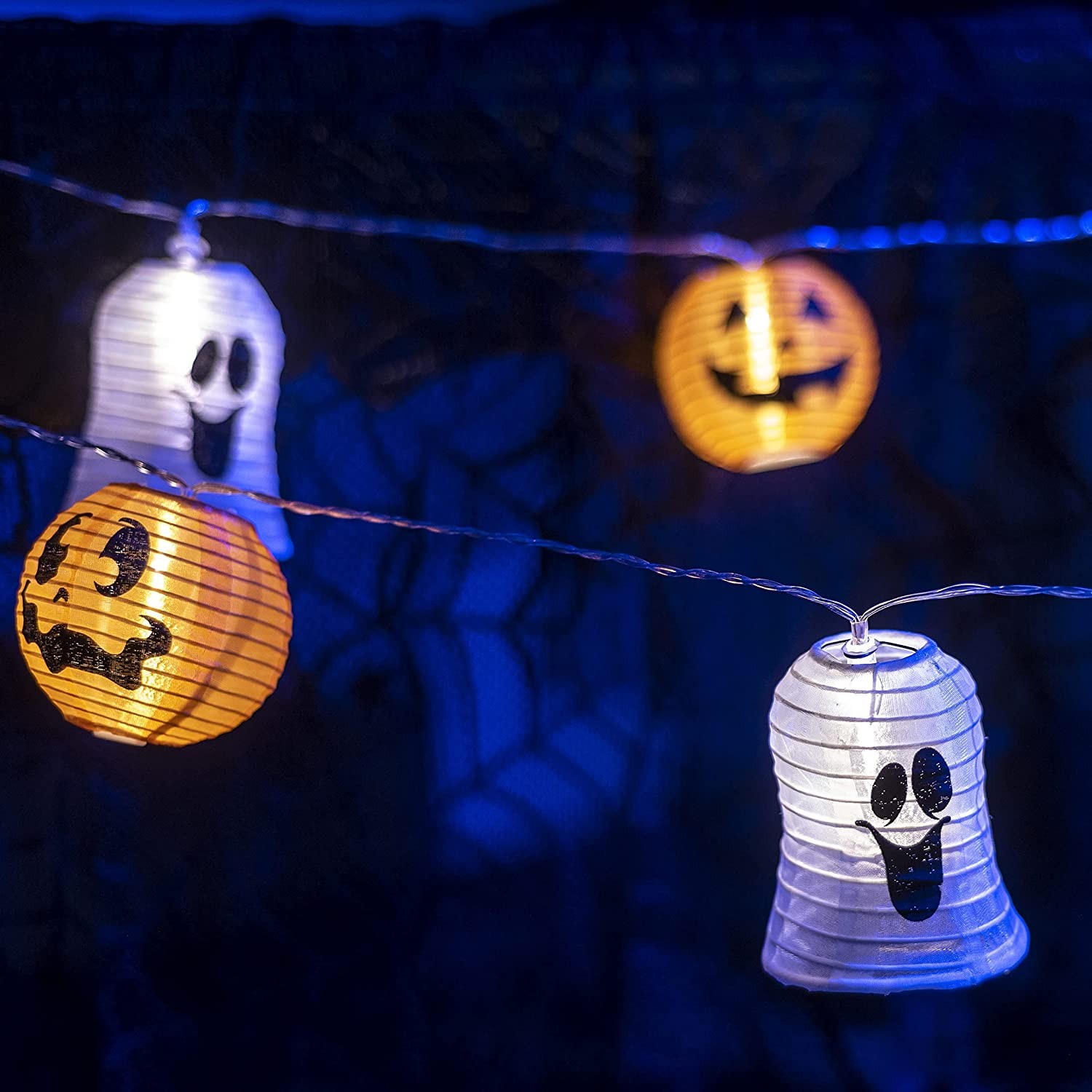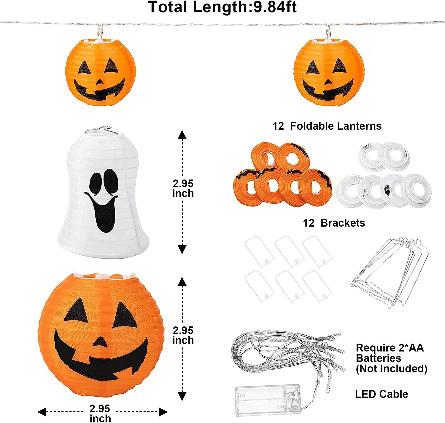 SUPER VALUE PACK: 12 Halloween orange pumpkin and ghost folding lanterns printed with "Smiley" in different designs, 12 holders, 12 mini LED lights and 9.84 feet string. Requires assembly for the flashlights, but easy to install and use. BATTERY POWERED. Battery-operated String Lights. This string of orange Halloween decorations lights in the shape of charming little pumpkins and ghosts really suit all kinds of indoors and outdoors décor, such as Halloween, parties, gardens, patios, families, windows, holidays, restaurants, hotels, commercial buildings and shopping malls. (Requires 2AA Batteries) PERFECT HALLOWEEN LIGHTS. Ideal for Halloween Indoor Outdoor Decoration, Halloween Light Show, Trick or Treat Party Decoration. The Halloween decorations pumpkin and ghost string lights are also a great choice for kids & families together to decorate their Halloween and it will be more fun. EASY TO USE. Safe and Easy to be Applied on All Different Places, Garden, Roof, Door, Window, Lawn etc. PREMIUM QUALITY. Child Safe: Non-Toxic. Meet US toy standards. Safety test approved. CUSTOMER SATISFACTION. Providing a great shopping experience is our main priority to our customers. Feel free to message us through “contact sellers'' if products don't meet your expectations. The celebrations start at JOYIN!
