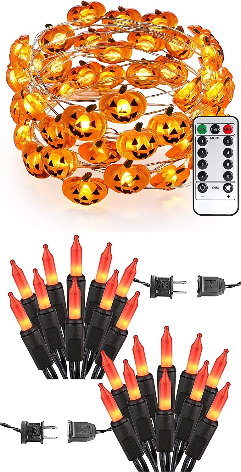 Pumpkin Halloween String Lights with Remote 8 Lighting Modes: Various lighting modes available, including combination, in wave, sequential, slo glo, chasing/flash, slow fade, twinkle/flash, steady on. Create various spooky Halloween atmosphere. Pumpkin Halloween String Lights with Remote Remote Control: Brings you great convenient operation with remote control included. 8 modes selected, brightness adjustment and timer function, all can be done through the remote. 300 Count Incandescent Orange Halloween String Lights: 150 counts per string with bulb space 0.21ft, 2.5V, and 0.43W per bulb, built-in 3A fuse for safety use. Extra bulbs and fuses included. Orange Halloween Lights String Connectable: These orange mini Halloween lights set can be end to end connect up to 3 sets (450 lights), expandable to a longer desire length for any project big or small. UL certified, great value and quality, safety use. Package Included: 1 x 40 LED Pumpkin Halloween String Lights with Remote, 2 X 150 Count Orange Halloween Lights String Connectable