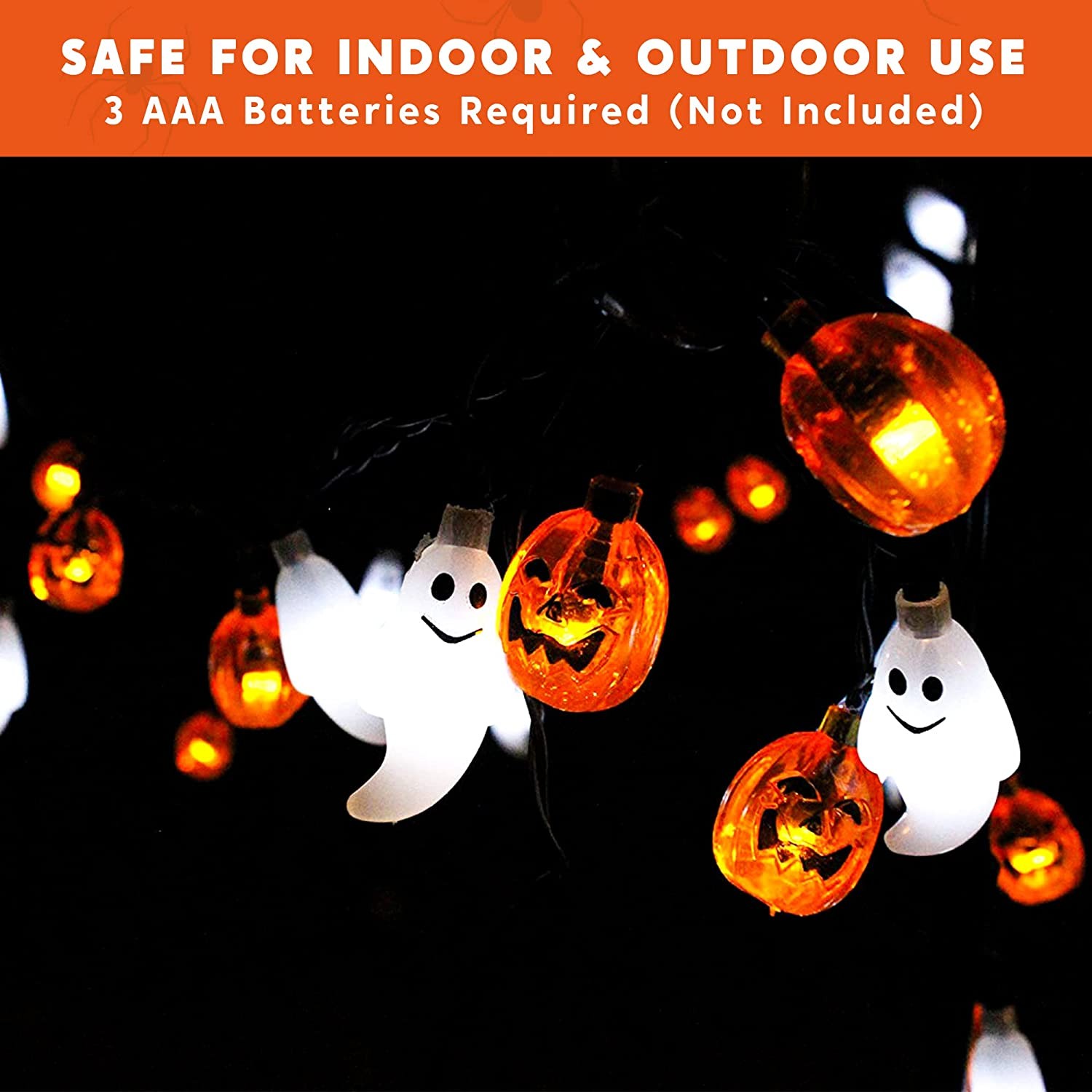 BATTERY POWERED. Battery-operated Weatherproof String Lights Can Be Used Indoors or Outdoors. PERFECT HALLOWEEN LIGHTS. Ideal for Halloween Indoor Outdoor Decoration, Halloween Light Show, Trick or Treat Party Decoration. SPECIFICATIONS: 19.7 Feet (4.9 Feet Leading Wire), 30 Ghost and Jack-O-Lantern Pumpkin Shape LED, 8 modes(Steady On, Flashing, Morphing, Switching Colors, etc.) WATERPROOF. Safe and Easy to be Applied on All Different Places, Garden, Roof, Door, Window, Lawn etc. MONEY BACK GURANTEE- "Contact Seller" and we will refund you or ship you a replacement if the one you received fail to work in 90 days.